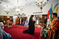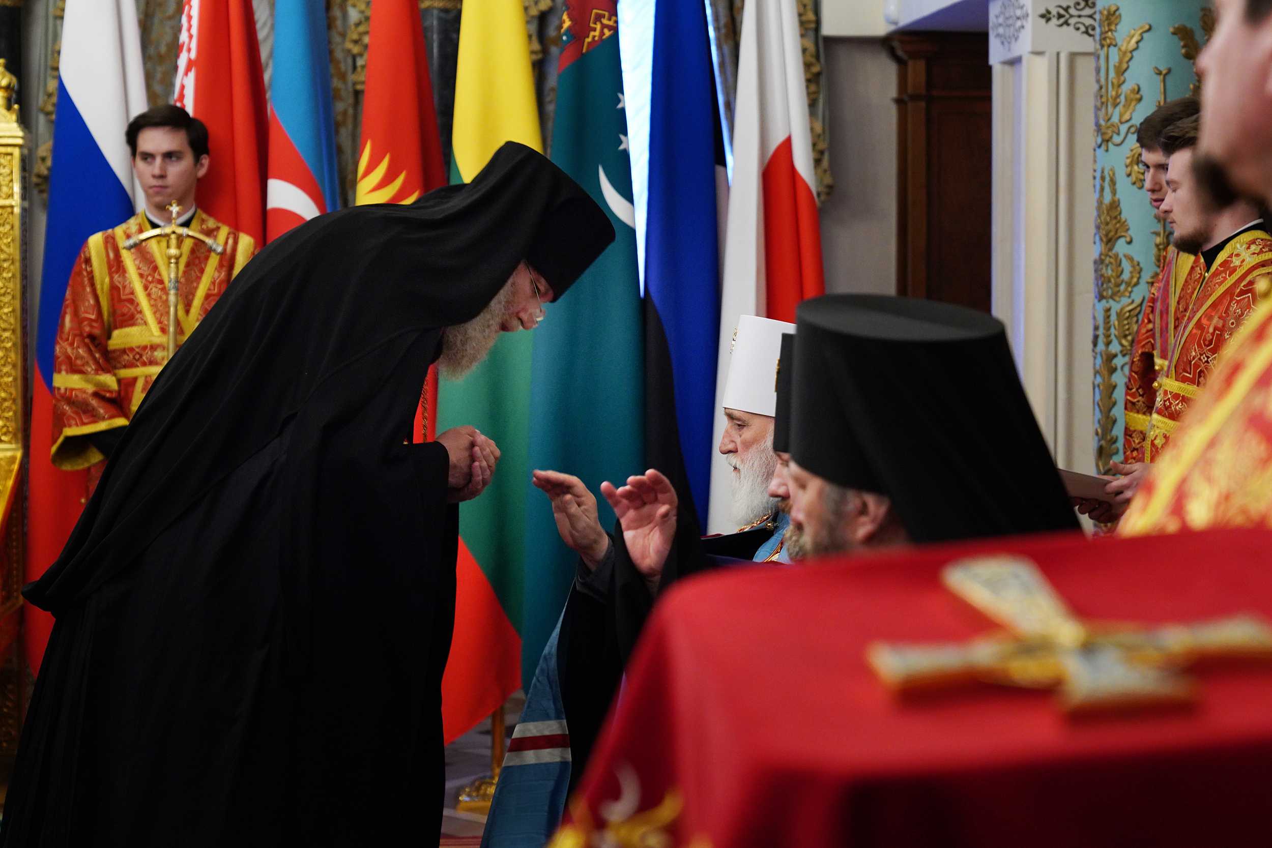 Его Святейшеству сослужили: митрополит Астанайский и Казахстанский Александр, глава Митрополичьего округа в Республике Казахстан; митрополит Крутицкий и Коломенский Павел, Патриарший наместник Московской митрополии; митрополит Воскресенский Дионисий, управляющий делами Московской Патриархии, первый викарий Патриарха Московского и всея Руси по г. Москве; архиепископ Одинцовский и Красногорский Фома, руководитель Административного секретариата Московской Патриархии; епископ Зеленоградский Савва, заместитель управляющего делами Московской Патриархии; епископ Луховицкий Евфимий, председатель Синодального миссионерского отдела.