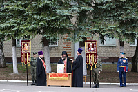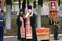 Священнослужители совершили молебен о даровании победы. Иерей Димитрий Довбыш преподнес в дар личному составу воинской части икону «Собор покровителей воинства Российского».