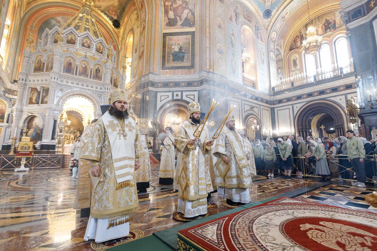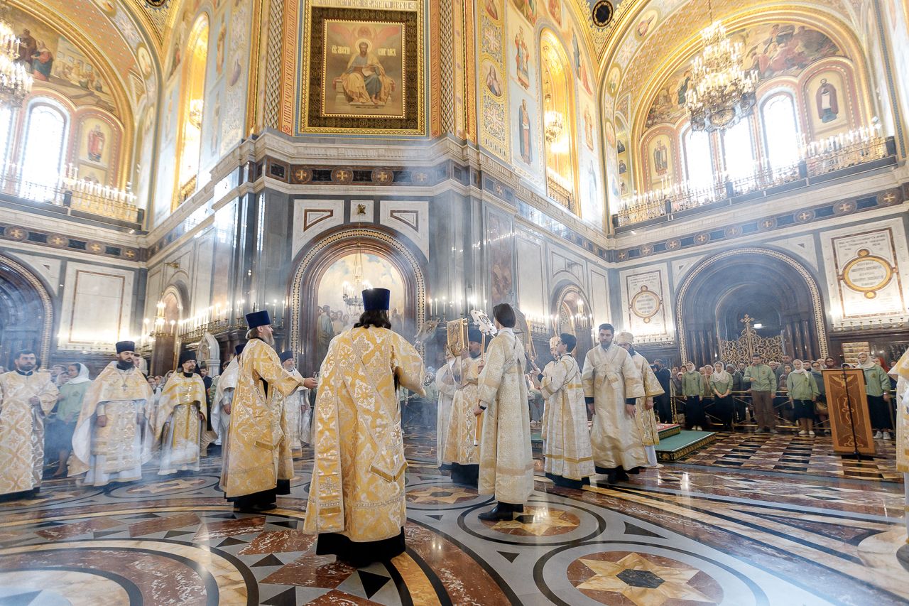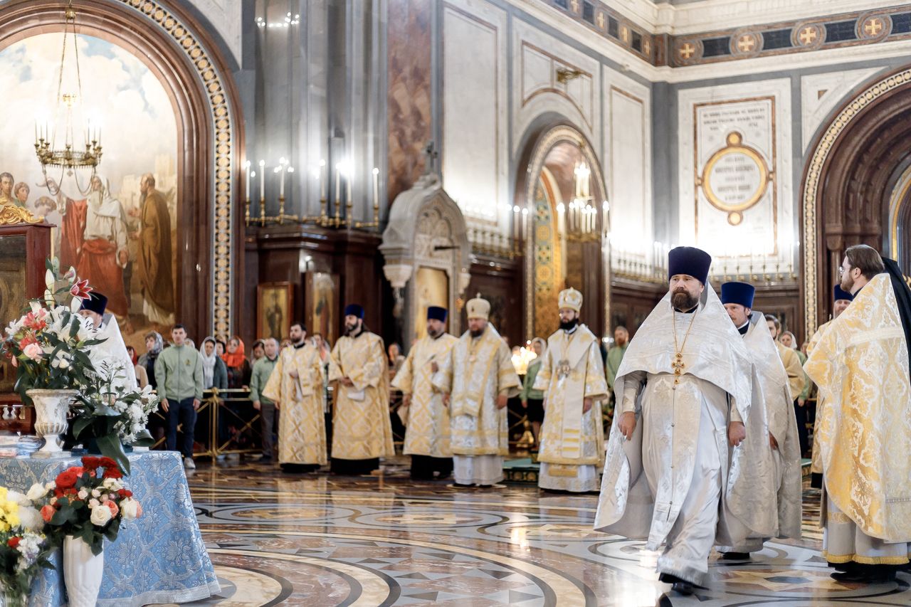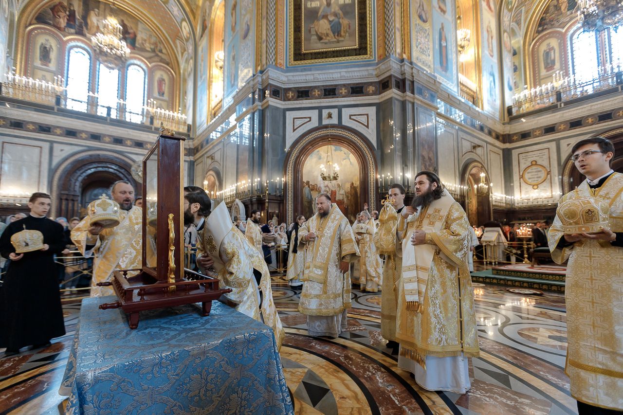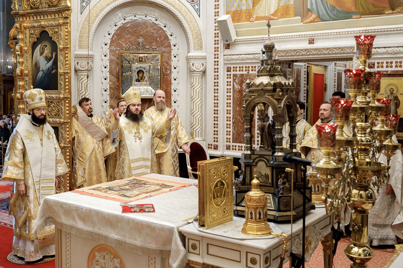 Божественную литургию возглавил председатель Отдела внешних церковных связей митрополит Волоколамский Антоний. Ему сослужили: митрополит Костромской и Нерехтский Ферапонт, епископ Сергиево-Посадский и Дмитровский Фома, ключарь Храма Христа Спасителя протоиерей Михаил Рязанцев, клирик собора Воскресения Христова на Дебре г. Костромы иеродиакон Иоасаф (Синявин), наместники ставропигиальных монастырей, благочинный Химкинского церковного округа протоиерей Артемий Гранкин, благочинный Долгопрудненского церковного округа протоиерей Андрей Хмызов, духовенство Троице-Сергиевой Лавры и Сергиево-Посадской епархии.