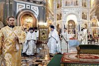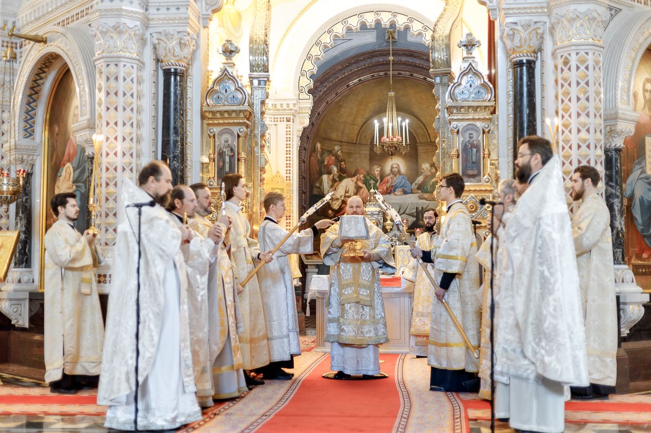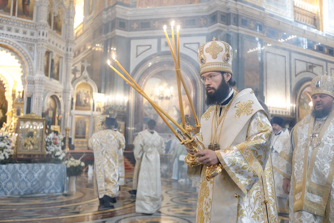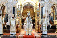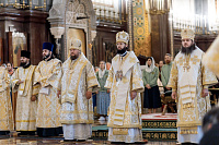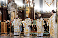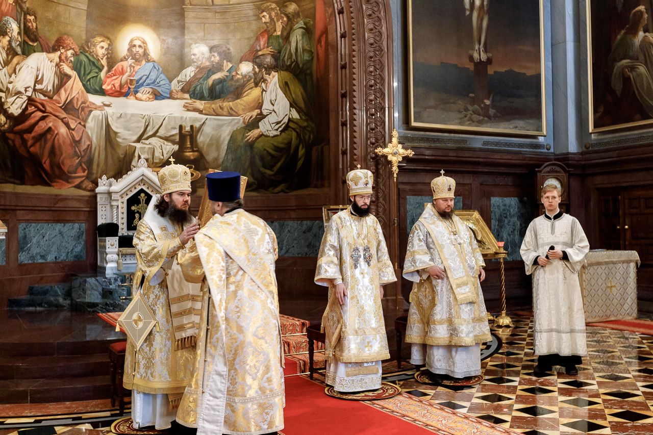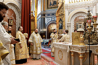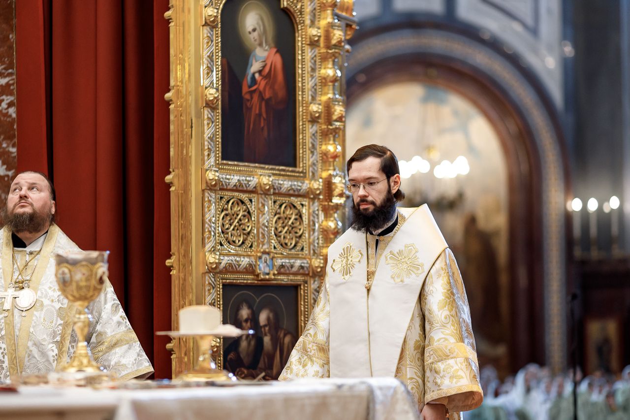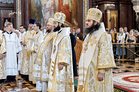 Божественную литургию возглавил председатель Отдела внешних церковных связей митрополит Волоколамский Антоний. Ему сослужили: митрополит Костромской и Нерехтский Ферапонт, епископ Сергиево-Посадский и Дмитровский Фома, ключарь Храма Христа Спасителя протоиерей Михаил Рязанцев, клирик собора Воскресения Христова на Дебре г. Костромы иеродиакон Иоасаф (Синявин), наместники ставропигиальных монастырей, благочинный Химкинского церковного округа протоиерей Артемий Гранкин, благочинный Долгопрудненского церковного округа протоиерей Андрей Хмызов, духовенство Троице-Сергиевой Лавры и Сергиево-Посадской епархии.