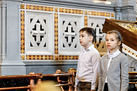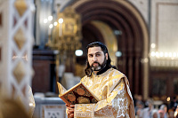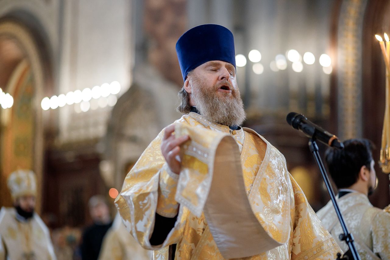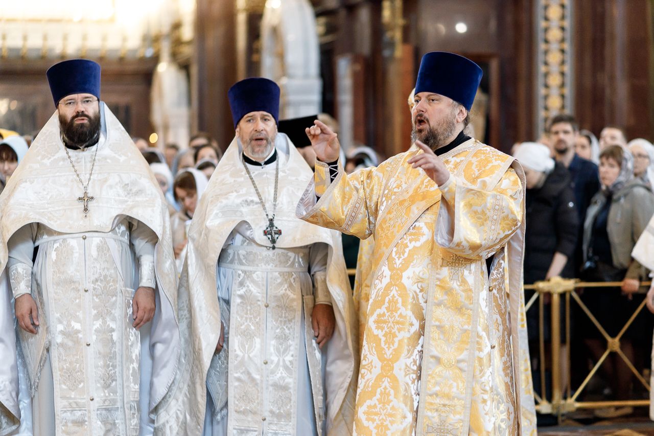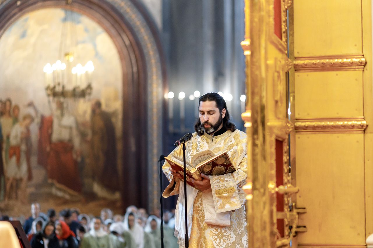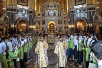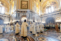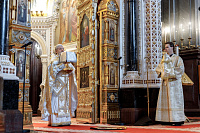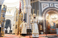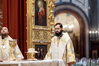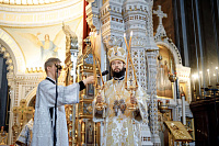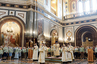 Песнопения Литургии исполнил Патриарший хор Храма Христа Спасителя под управлением Ильи Толкачева.