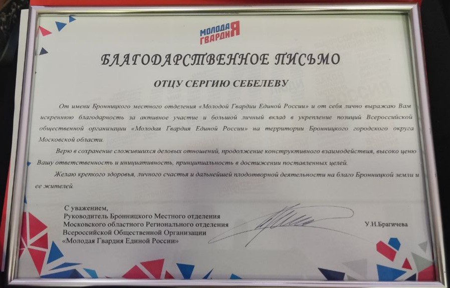 За активное участие и большой личный вклад в укрепление позиций Всероссийской общественной организации "Молодая Гвардия Единой России" был награждён благочинный 1-го Бронницкого округа иерей Сергий Себелев.