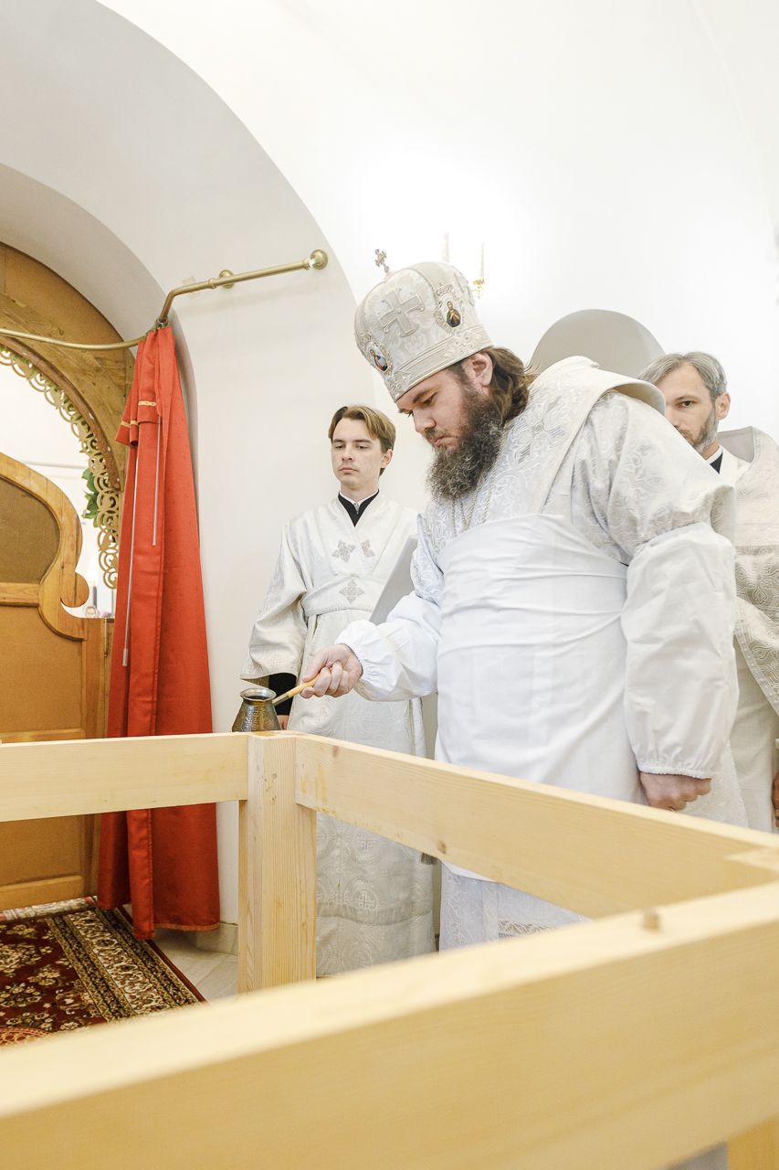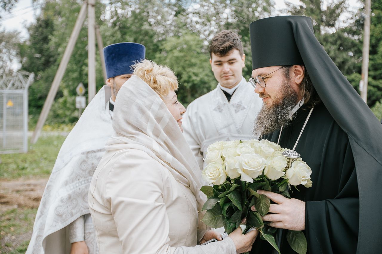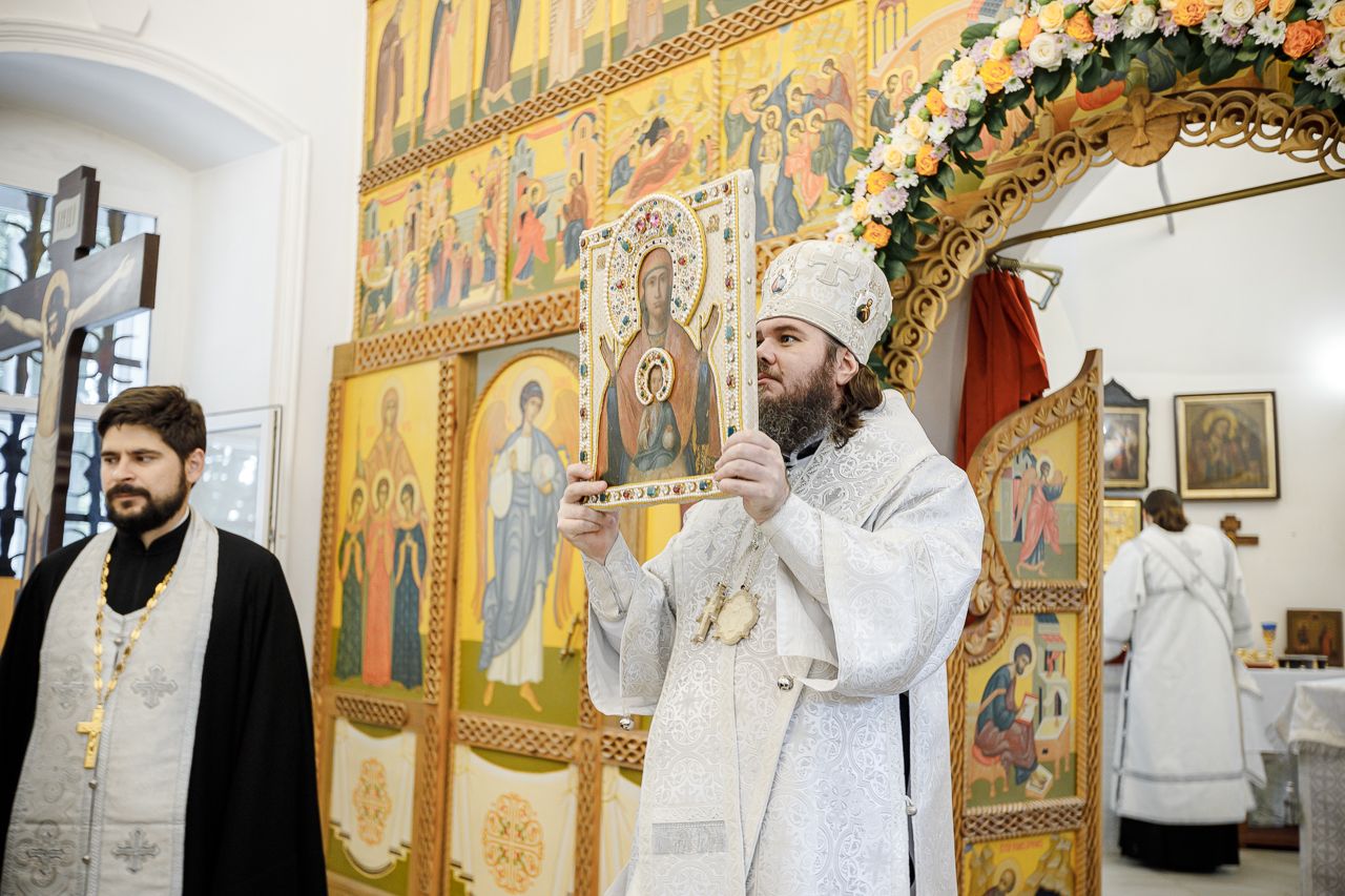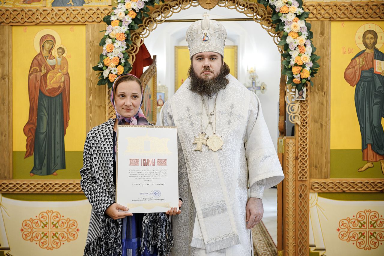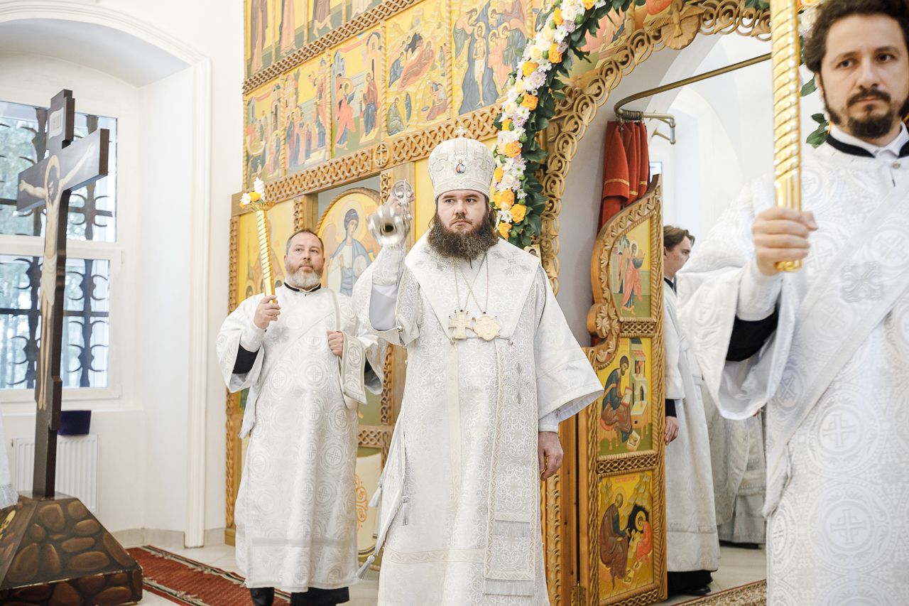 После Литургии настоятель храма поблагодарил Владыку за архипастырский визит и вручил памятный подарок. В ответном слове епископ Фома выразил благодарность иерею Дионисию за совместное богослужение и вручил в дар храму богослужебные покровцы, изготовленные в золотошвейной мастерской Троице-Сергиевой Лавры, и набор богослужебных копий. Также Владыка обратился с архипастырским словом ко всем присутствовавшим.