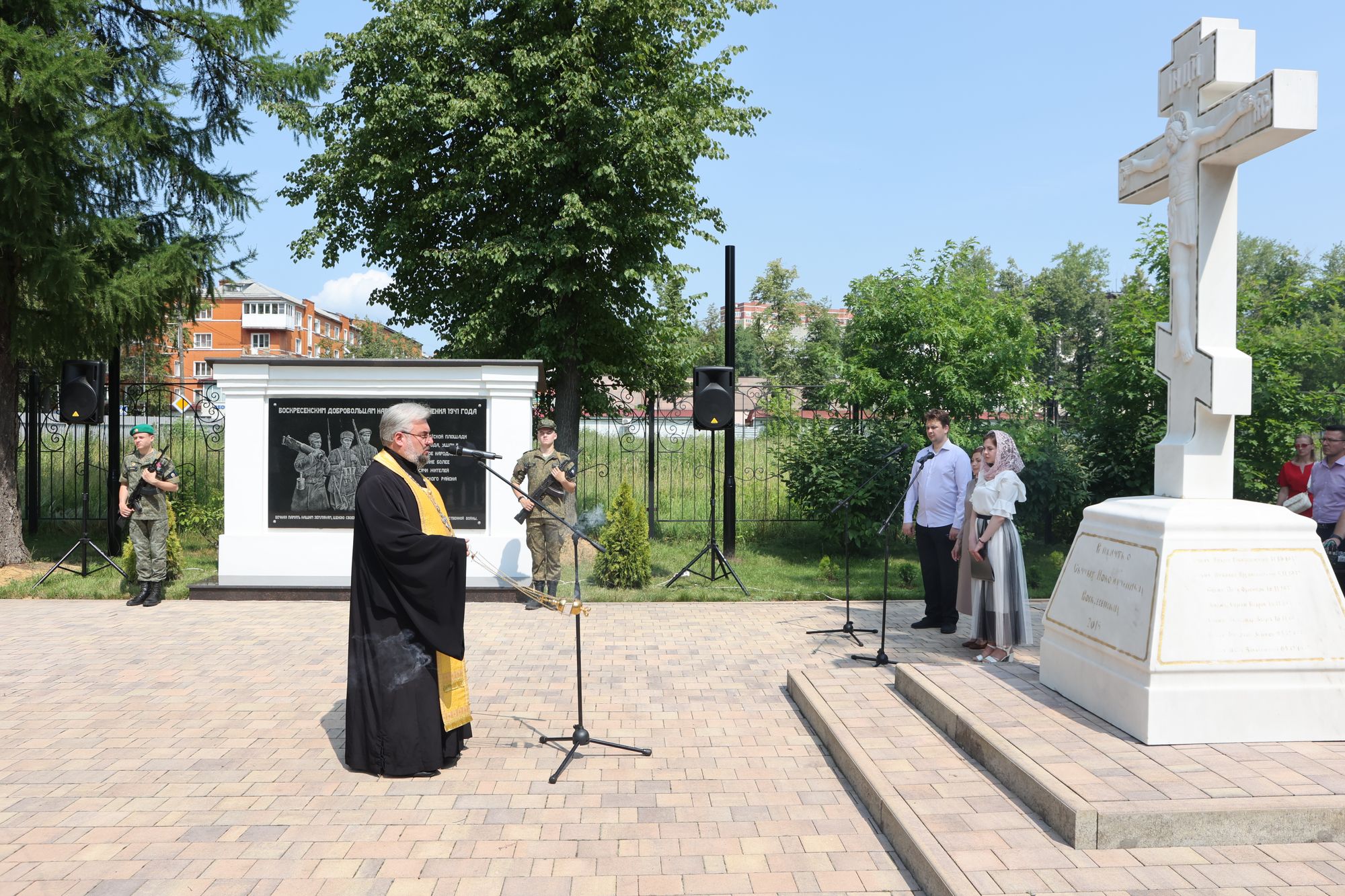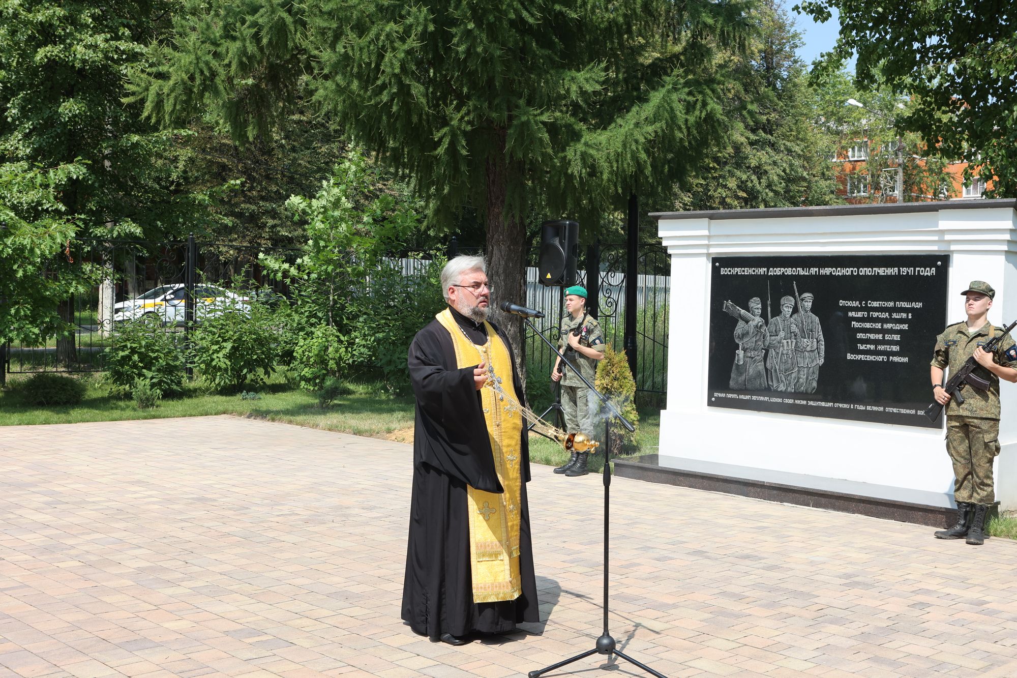 В память об ополченцах председатель Отдела по взаимодействию с Вооруженными силами, правоохранительными органами и казачеством Коломенской епархии, благочинный 2-го Воскресенского церковного округа протоиерей Сергий Рыбаков совершил у мемориала заупокойную литию.