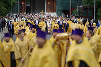 Участники богослужения поклонились честным мощам равноапостольного Крестителя Руси, ковчег с частицей которых был принесен крестным ходом из Кремля на Боровицкую площадь.