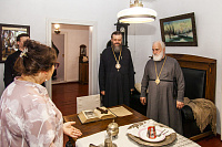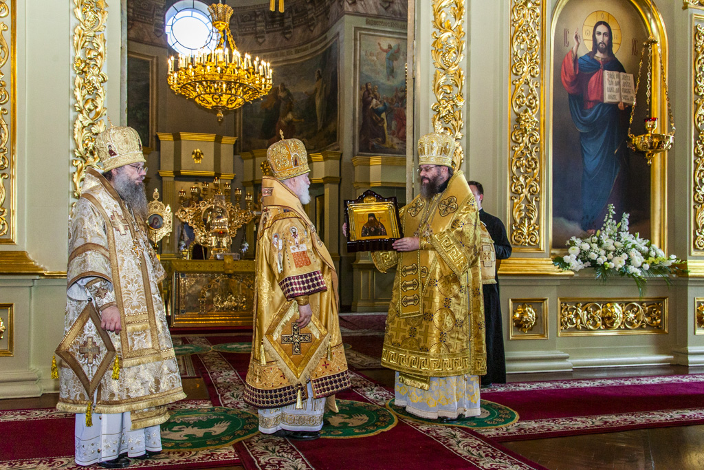 В завершении богослужения архипастыри поздравили тамбовчан с праздником и обратились с приветственным словом, после чего владыка Феодосий преподнёс владыке Павлу памятные подарки и икону святителя Питирима.