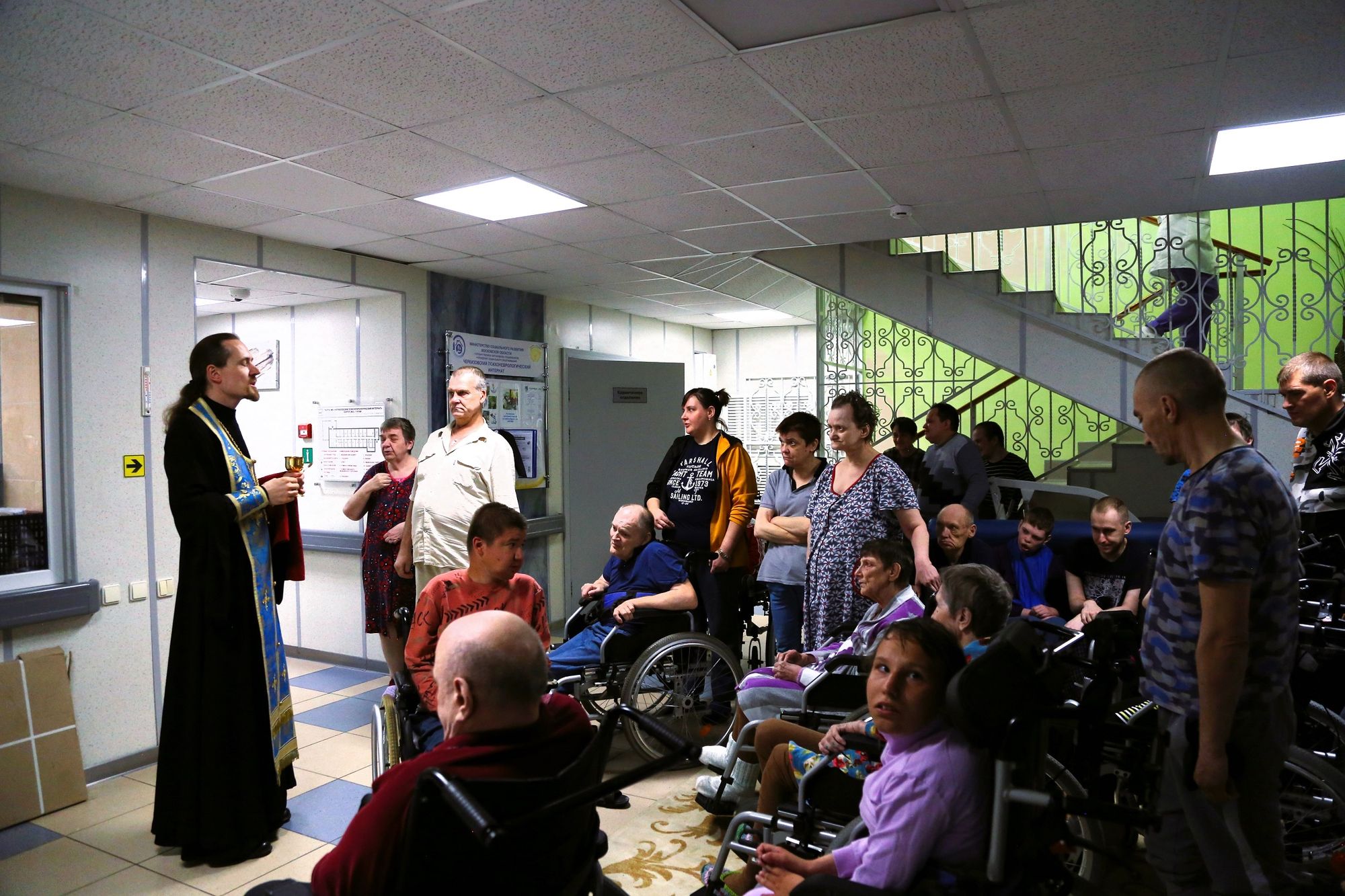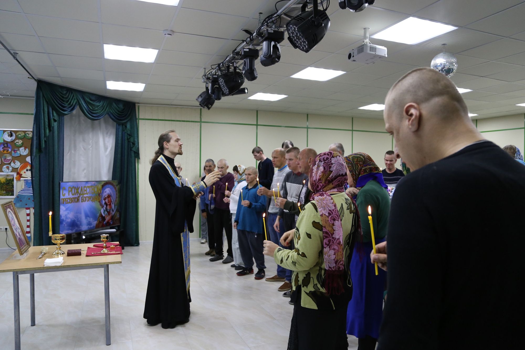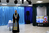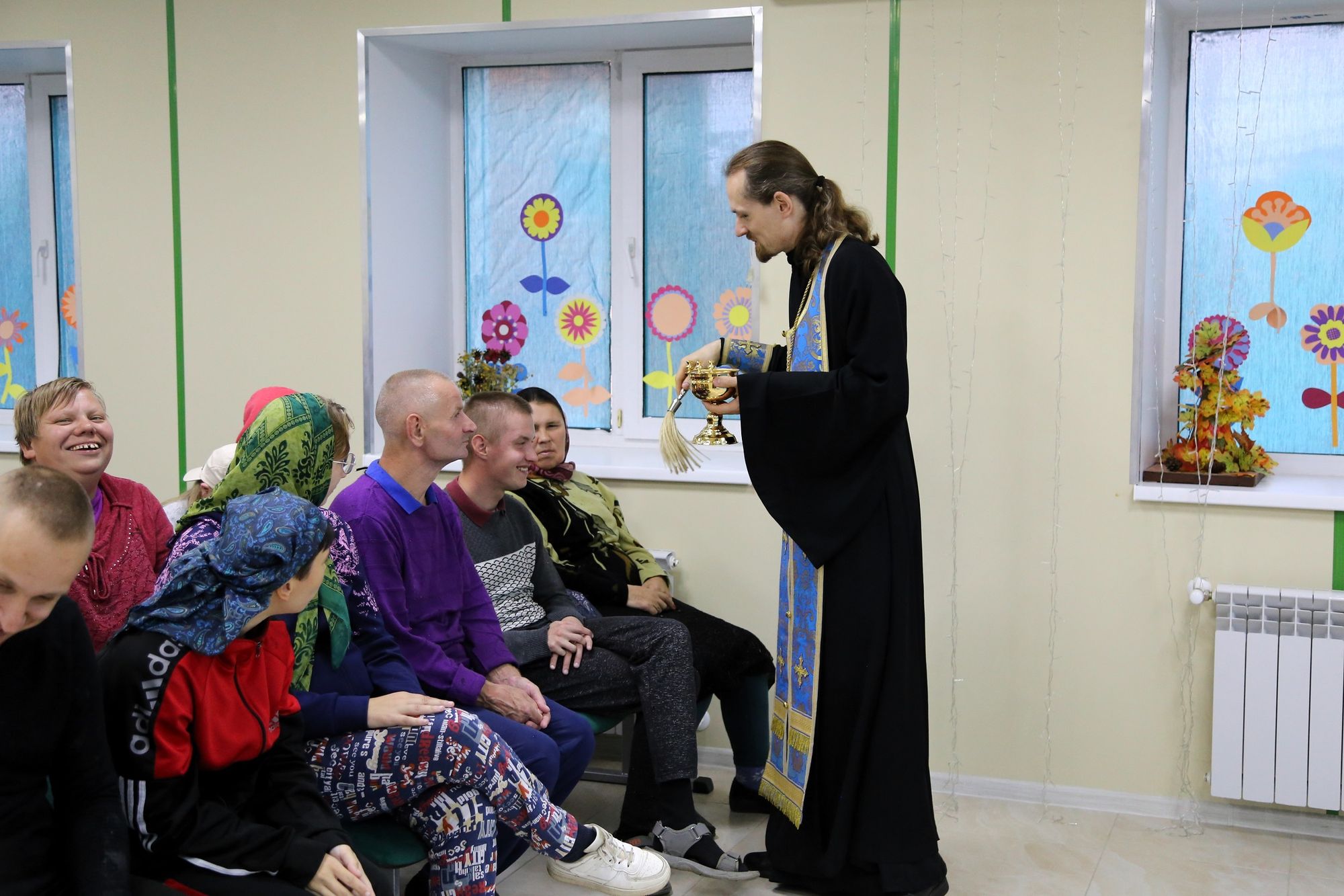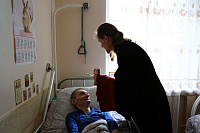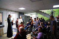 Сначала иерей Иоанн в актовом зале учреждения совершил молебен и причастил собравшихся. Затем иерей Иоанн посетил тяжкоболяжих проживающих в комнатах, беседуя и совершая Таинство Причастия всех желающих. Завершилось посещение чаепитием, во время которого иерей Иоанн рассказал о празднике Рождества Пресвятой Богородицы.