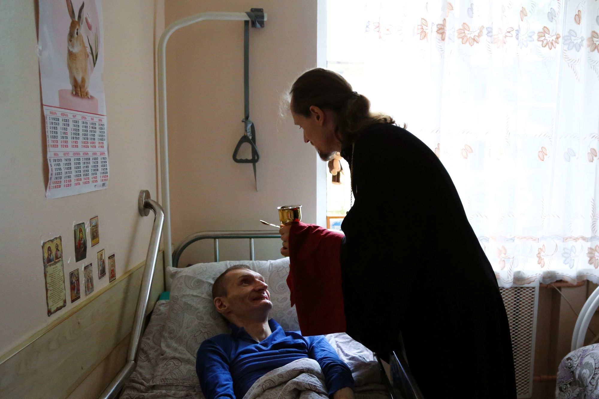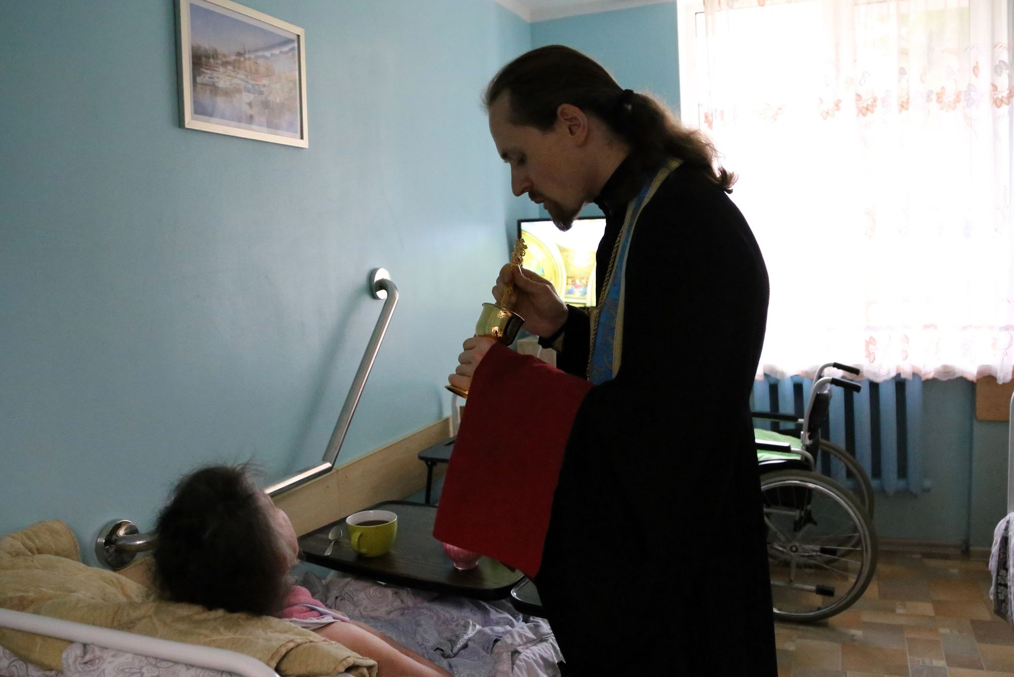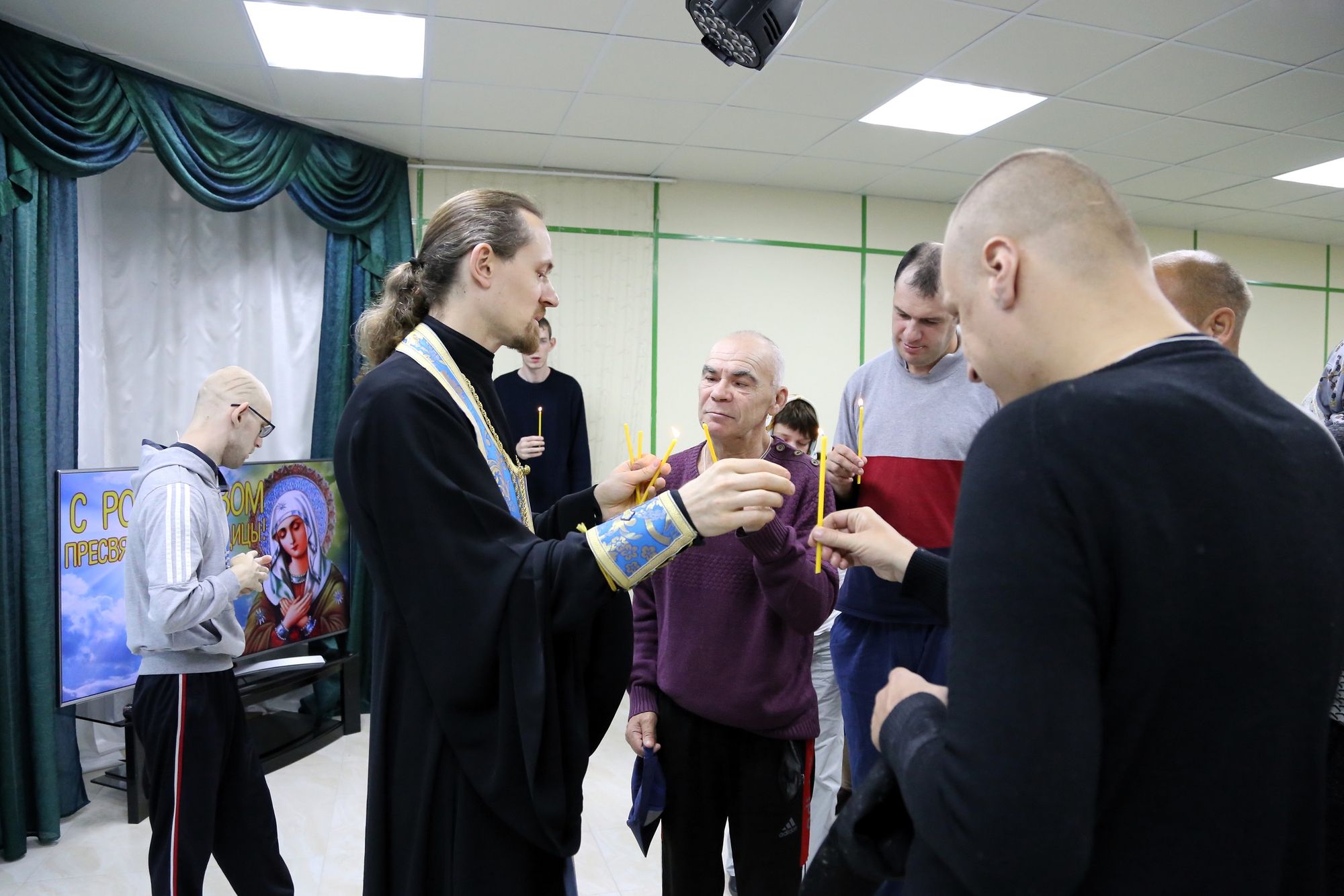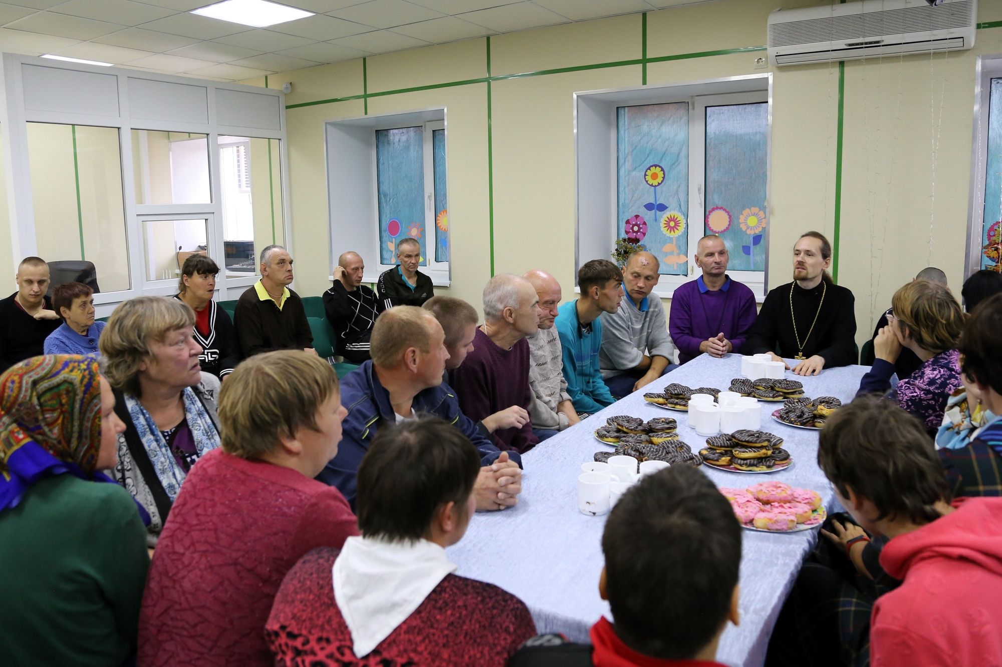 Сначала иерей Иоанн в актовом зале учреждения совершил молебен и причастил собравшихся. Затем иерей Иоанн посетил тяжкоболяжих проживающих в комнатах, беседуя и совершая Таинство Причастия всех желающих. Завершилось посещение чаепитием, во время которого иерей Иоанн рассказал о празднике Рождества Пресвятой Богородицы.