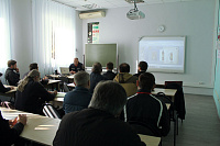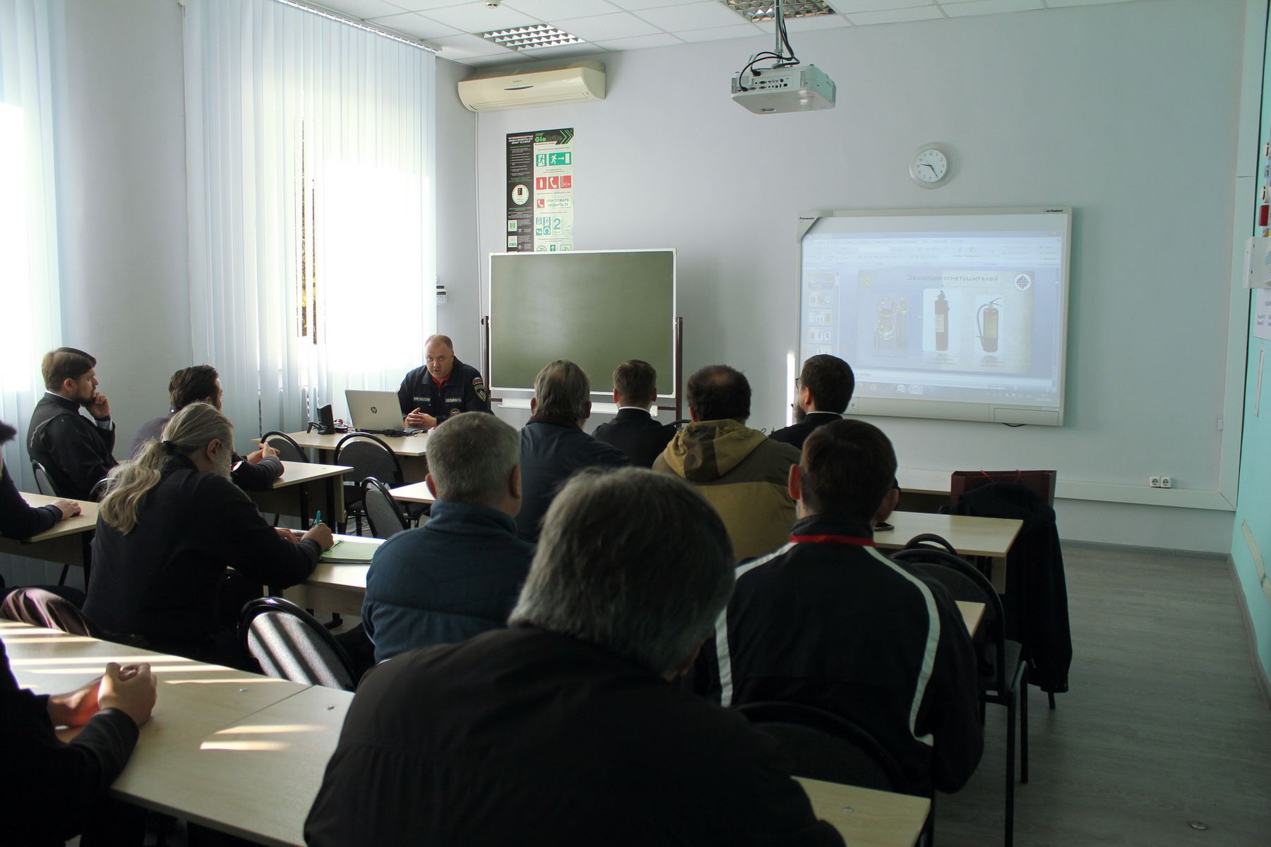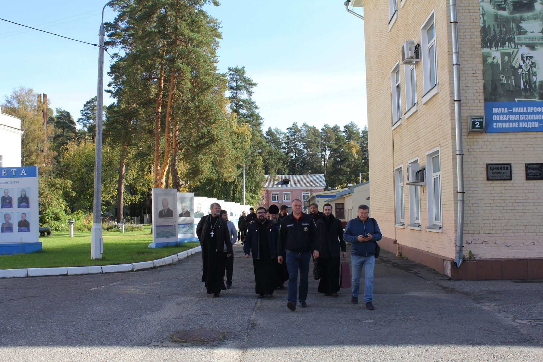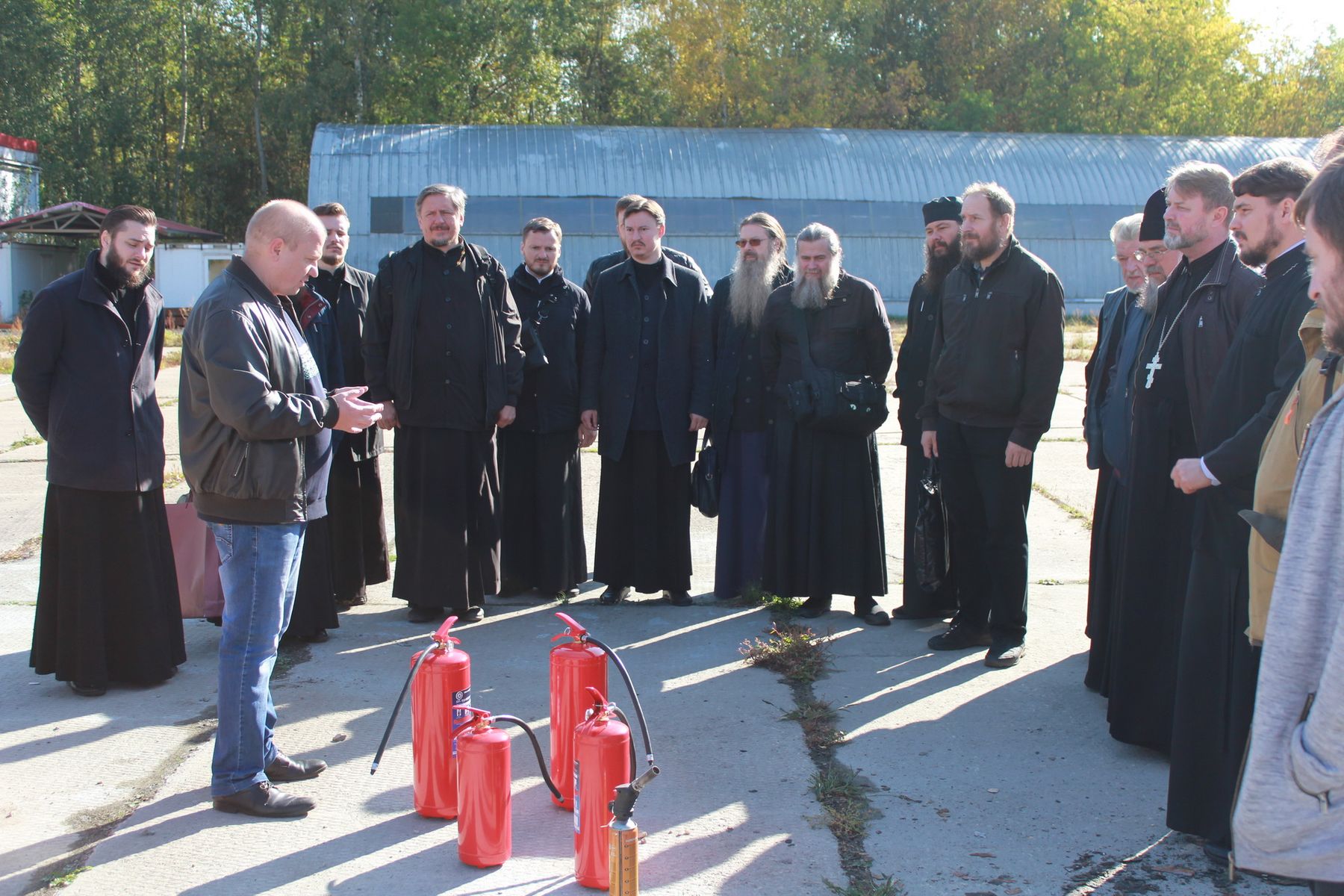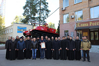 Начальник научно-исследовательского центра автоматических установок обнаружения и тушения пожаров полковник внутренней службы Р. А. Емельянов ознакомил присутствующих с классификацией и устройством огнетушителей, после чего в сопровождении заместителя начальника центра полковника внутренней службы А. В. Казакова священнослужители проследовали на учебный полигон, где имели возможность на практике ознакомиться с работой огнетушителей.