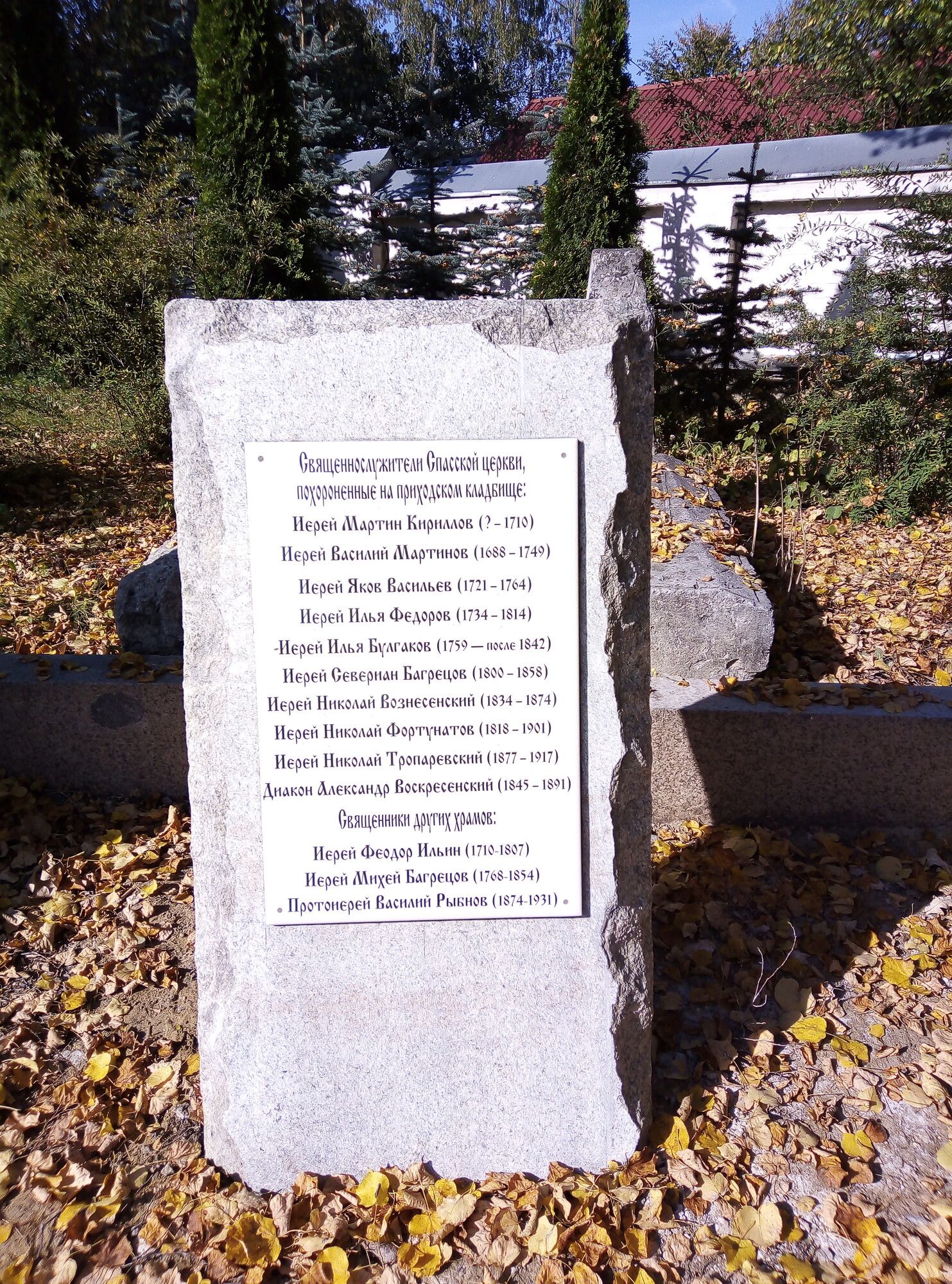 27 сентября во дворе Спасского храма рядом с надгробными памятниками, найденными при проведении реставрационных работ, было завершено оформление каменной плиты с именами священнослужителей, похороненных на приходском кладбище до разорения церкви.