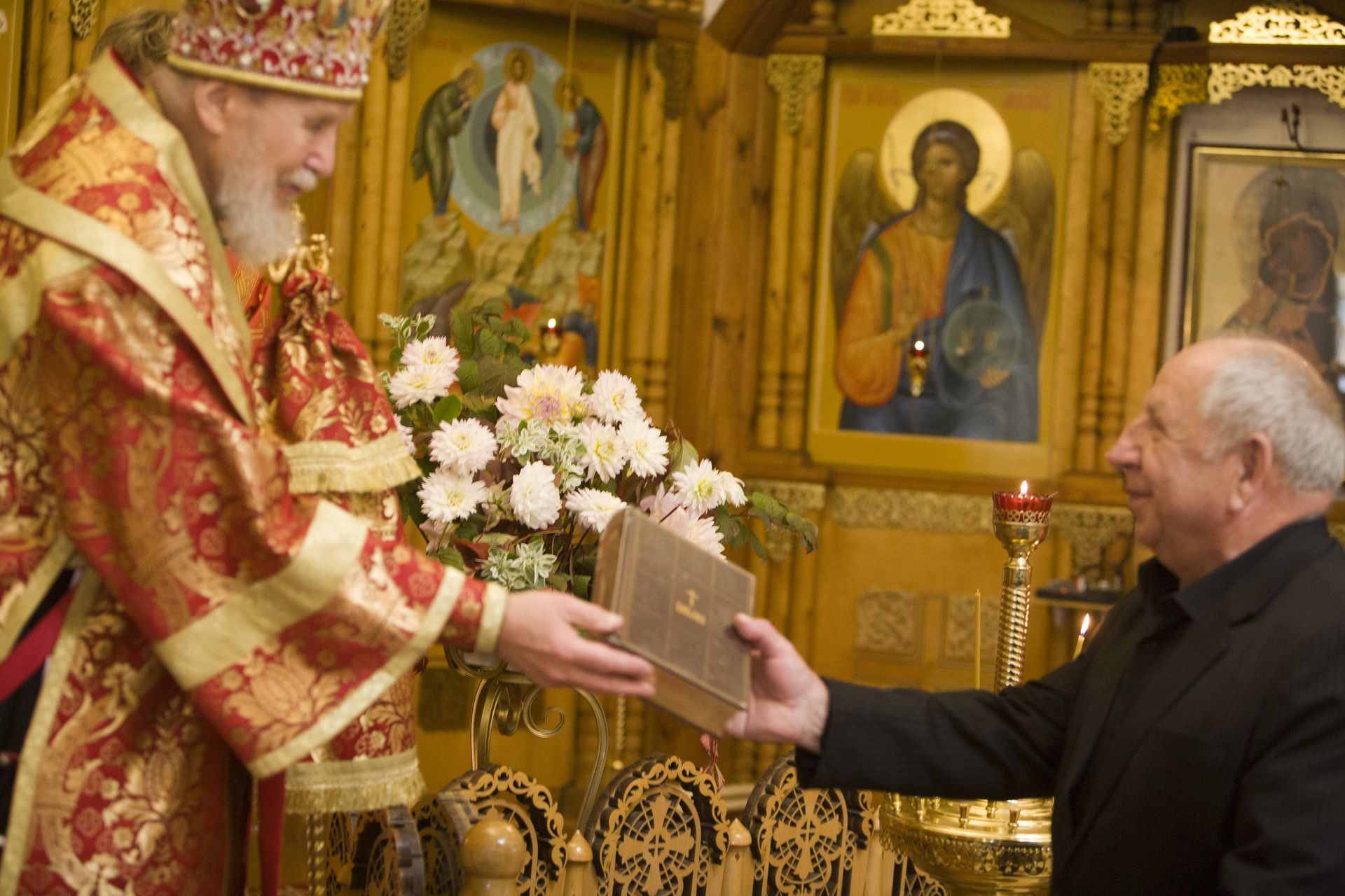 Затем Его Преосвященство обратился к сослужившему духовенству и молящимся с архипастырским словом и подарил В. Г. Ларионову новое издание Библии в благословение за труды во благо Святой Церкви.