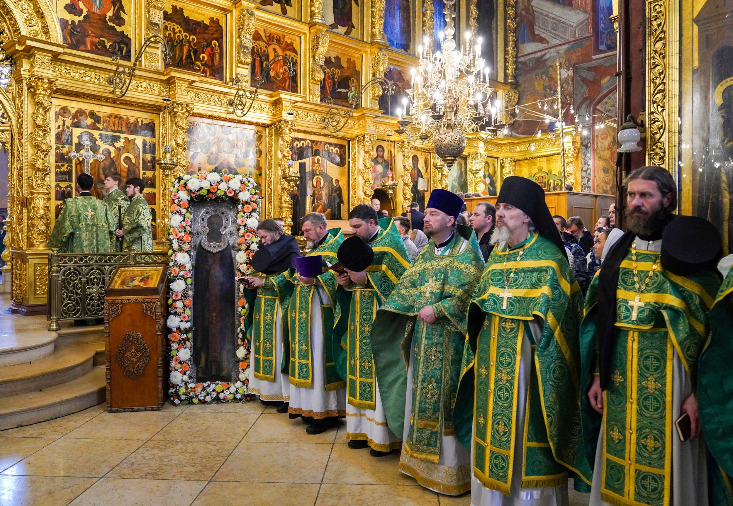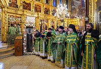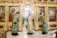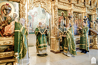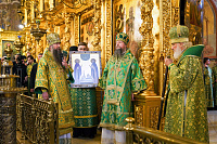 По окончании Литургии Святейший Патриарх Кирилл совершил в Успенском соборе молебен перед чтимой иконой преподобного Сергия Радонежского.