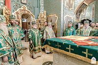Затем Святейший Патриарх Кирилл поклонился мощам преподобного Сергия Радонежского в Троицком соборе, а также святыням Никоновского придела и Серапионовой палаты.