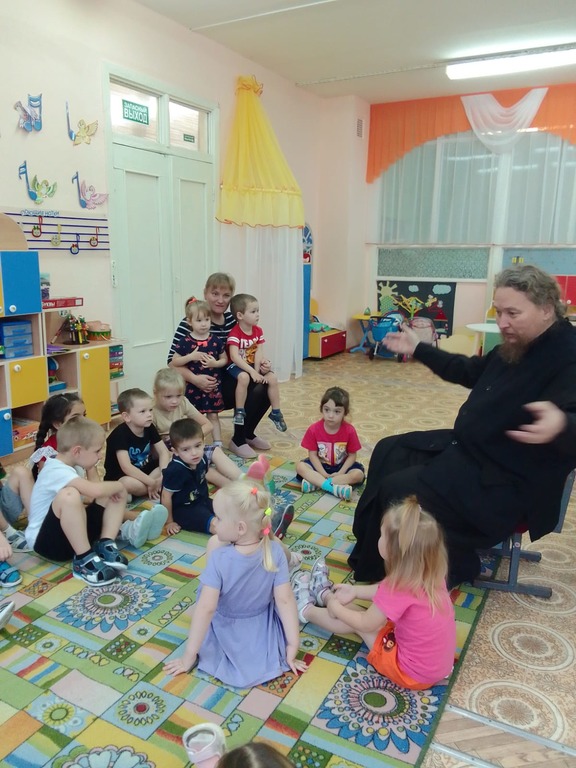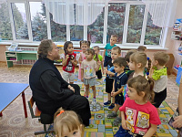 8 ноября в зданиях МАДОУ «Детский сад №19 «Зёрнышко» в п. Зарайский и д. Летуново Зарайского округа состоялась встреча настоятеля Успенского храма д. Рожново протоиерея Михаила Сокрутова с воспитанниками сада. В здании п. Зарайский собеседники поговорили о вере и добре. В д. Летуново ребята посетили Владимирский храм, где услышали рассказ о главной иконе храма, узнали несложные молитвы и позвонили в колокола.