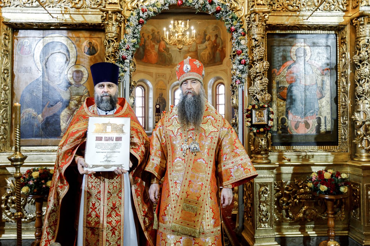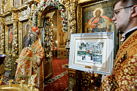 Затем Владыка преподнес в дар храму картину с изображением Троице-Сергиевой Лавры и вручил грамоту Сергиево-Посадской епархии клирику Успенского собора г. Дмитрова иерею Вадиму Кульвановскому.