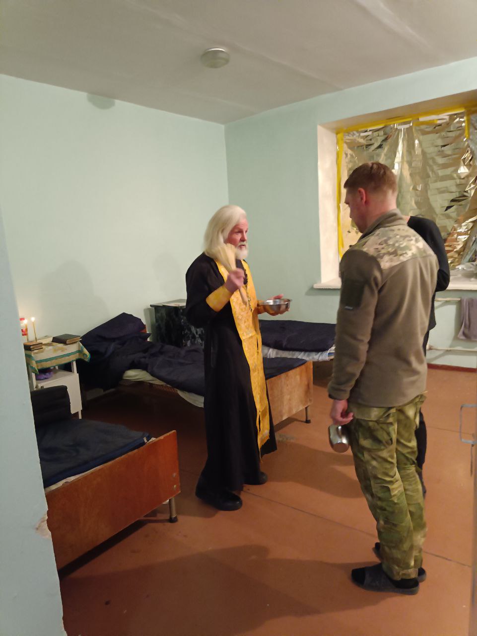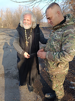 Участники гуманитарной миссии посетили 2 госпиталя. В одной из больниц отец Олег пособоровал раненных и медработников. Посетив еще одно медицинской учреждение, батюшка совершил молебен.