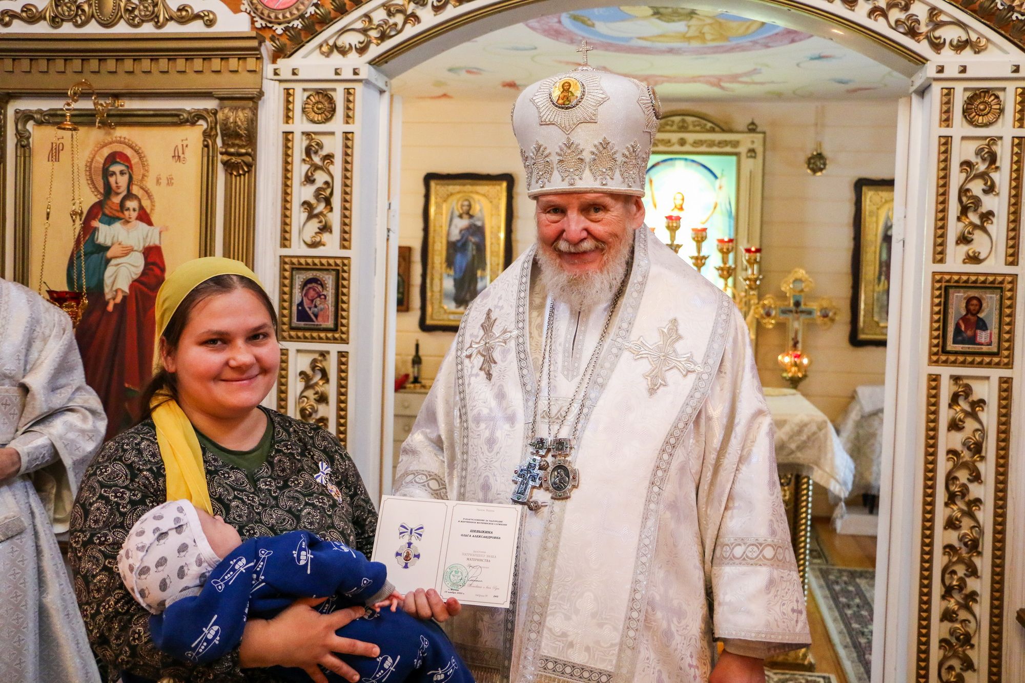 Затем Его Преосвященство обратился к сослужившему духовенству и молящимся с архипастырским словом и вручил Патриаршие Знаки Материнства II степени многодетным жёнам священнослужителей Шатурского благочиния: Ольге Александровне Шевыкиной – супруге настоятеля Троицкого храма села Шарапово священника Евгения Шевыкина и Ольге Александровне Депутатовой – супруге настоятеля Преображенского храма деревни Андреевские выселки священника Илии Депутатова.