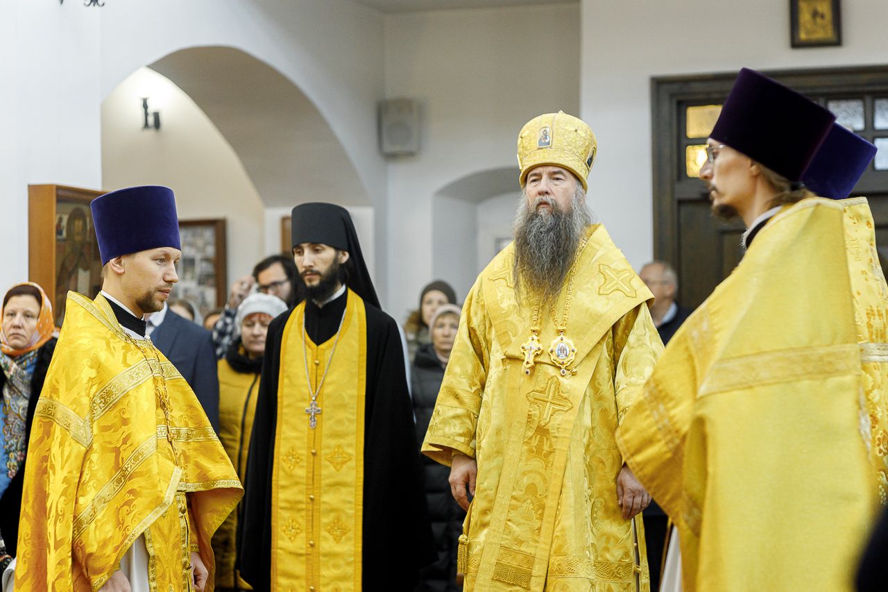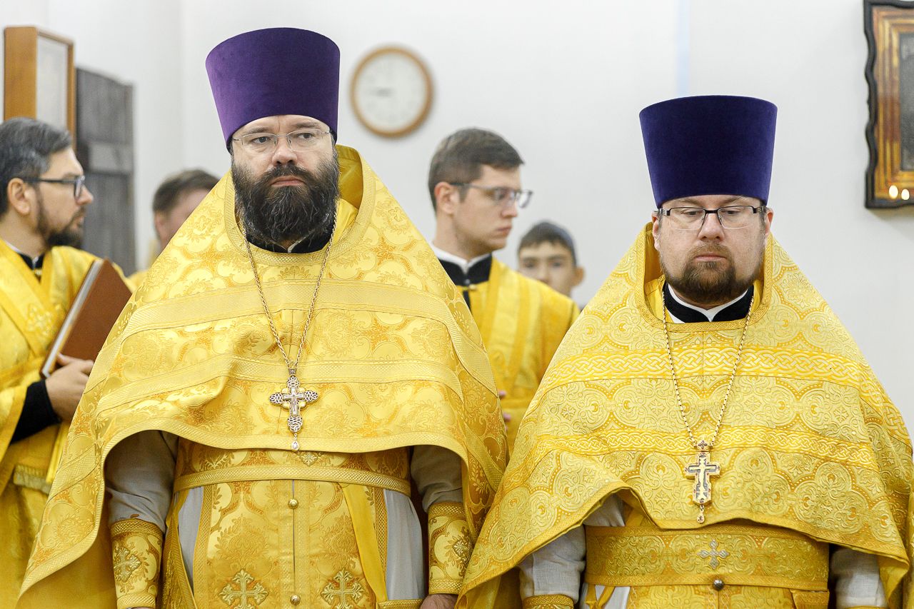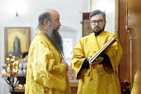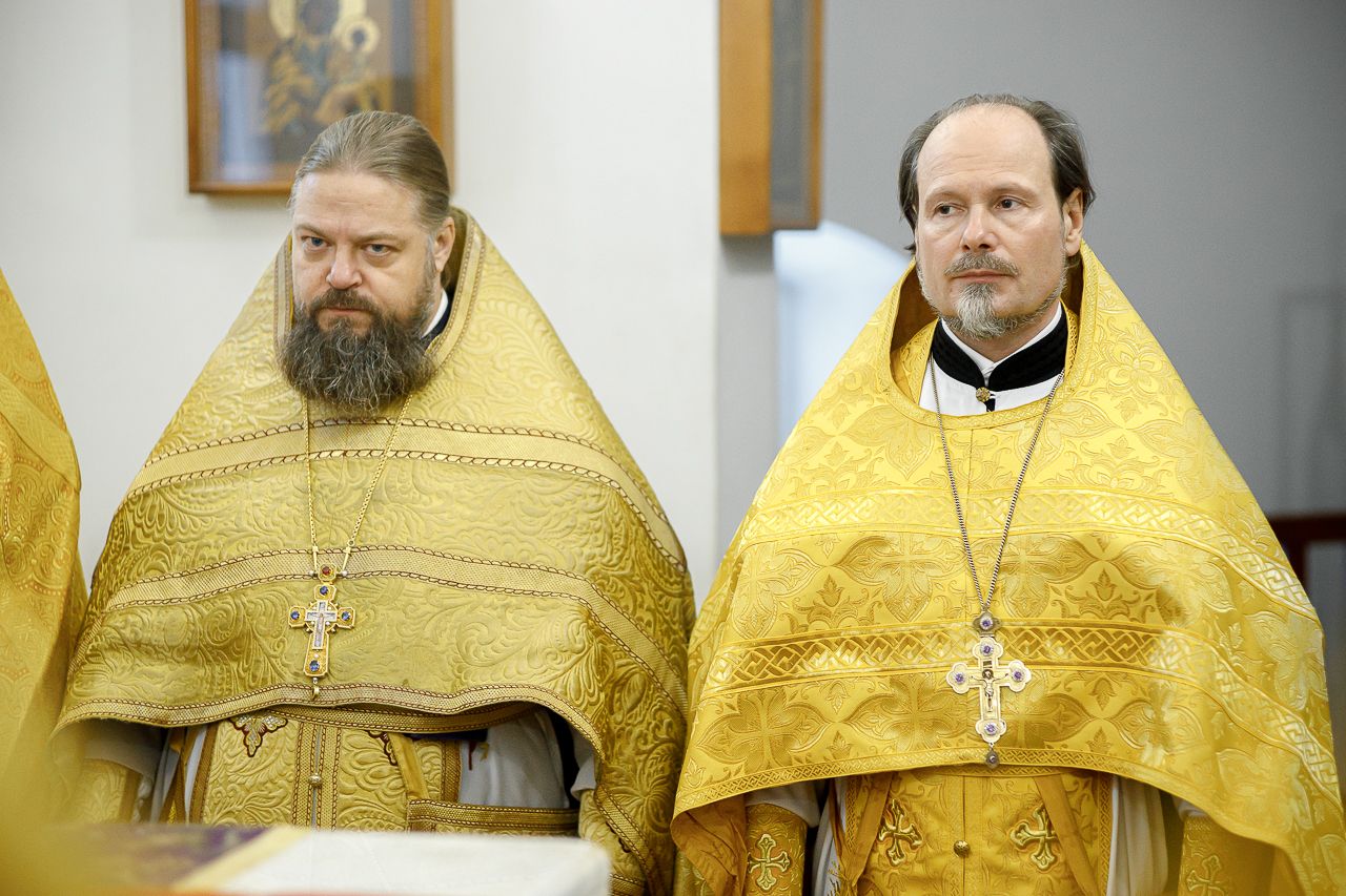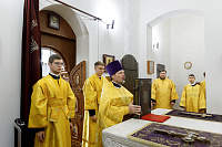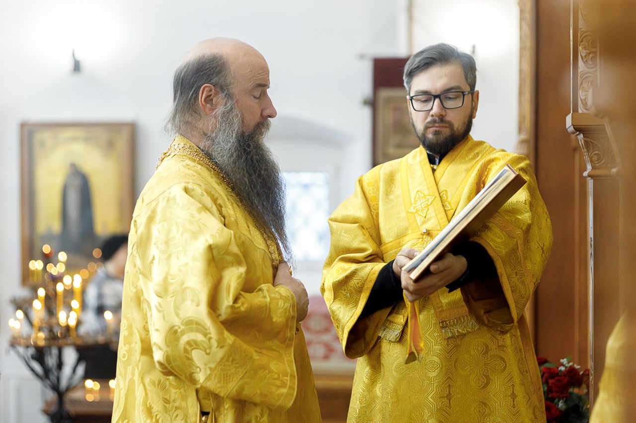 Его Преосвященству сослужили: благочинный Долгопрудненского церковного округа настоятель храма Преображения Господня протоиерей Андрей Хмызов, благочинный Химкинского церковного округа протоиерей Артемий Гранкин, благочинный Солнечногорского церковного округа протоиерей Антоний Тирков, а также приглашенное духовенство.