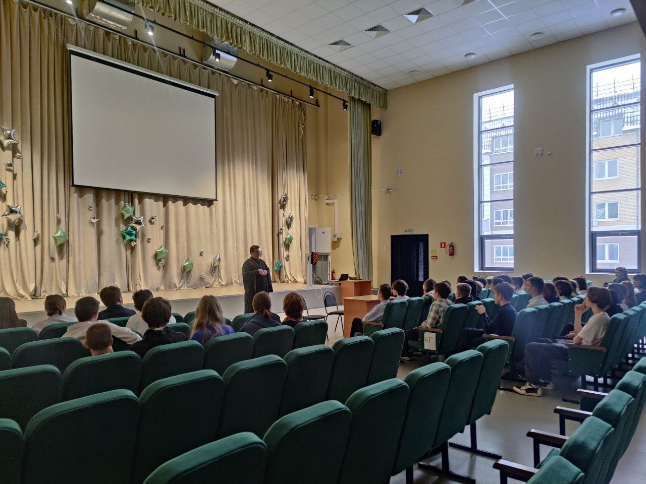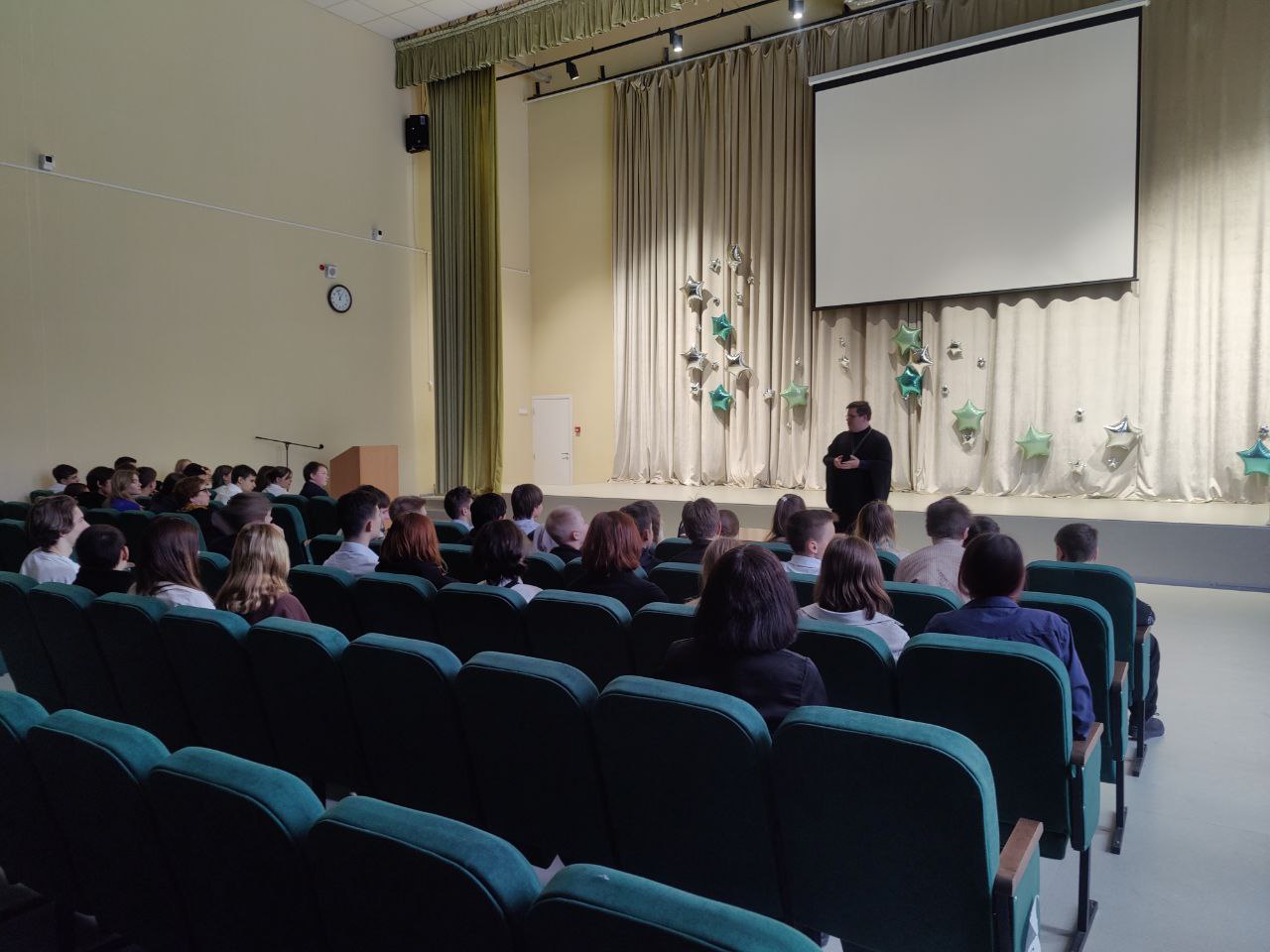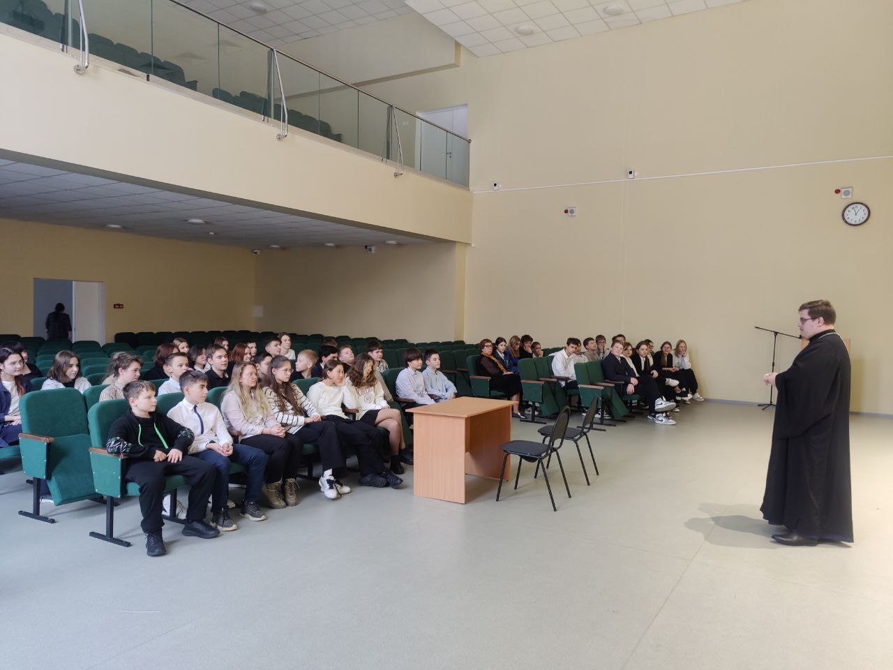 30 ноября в филиале МАОУ «Гимназия «Российская школа» настоятель Петрофеврониевского храма г. Королёва иерей Димитрий Нестеров ответил на вопросы учеников 8-х классов. Мероприятие было организовано в рамках формата «100 вопросов взрослому». Иерей Димитрий рассказал учащимся о приближающемся празднике Рождества Христова и ответил на интересующие подростков вопросы о вере и Церкви.