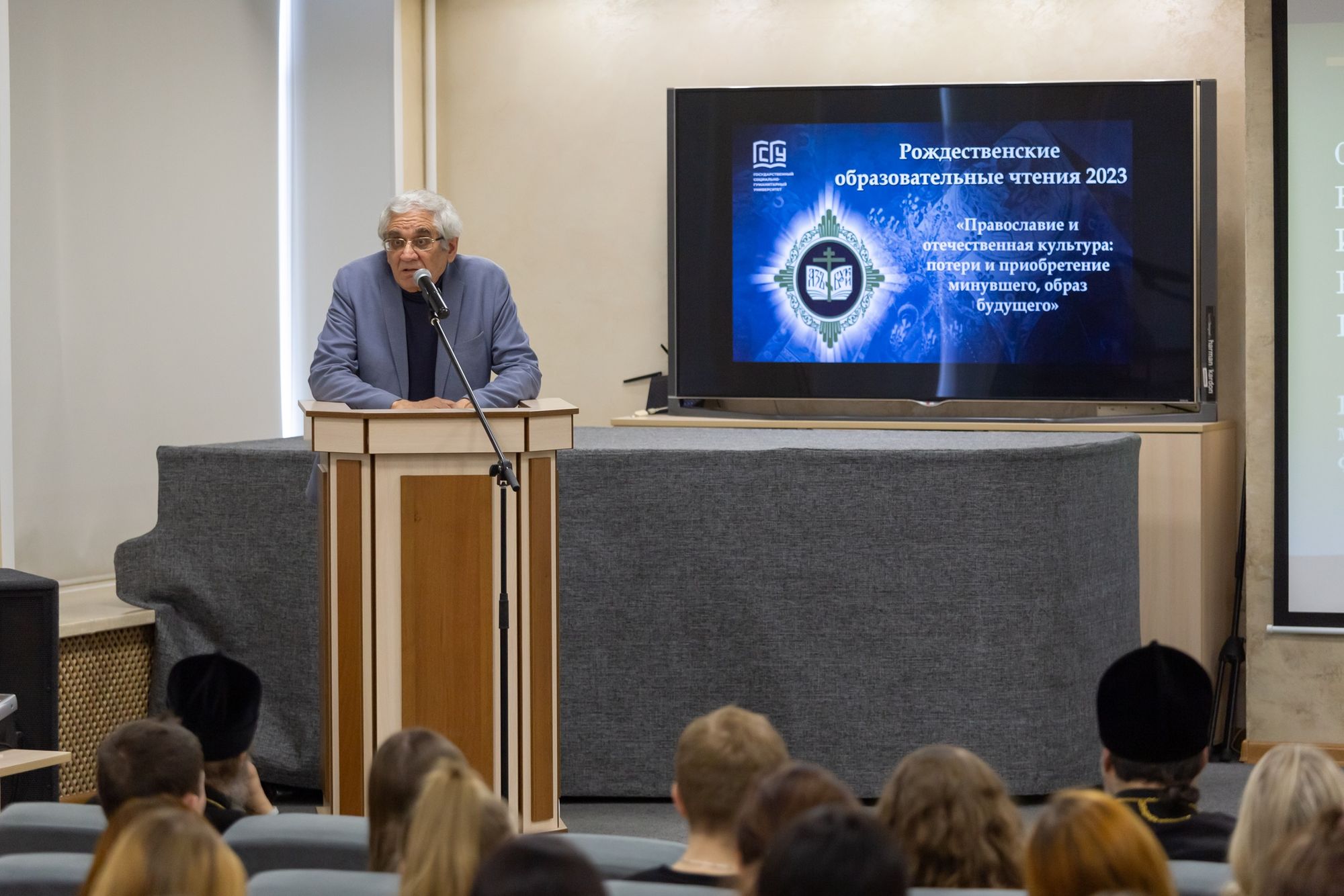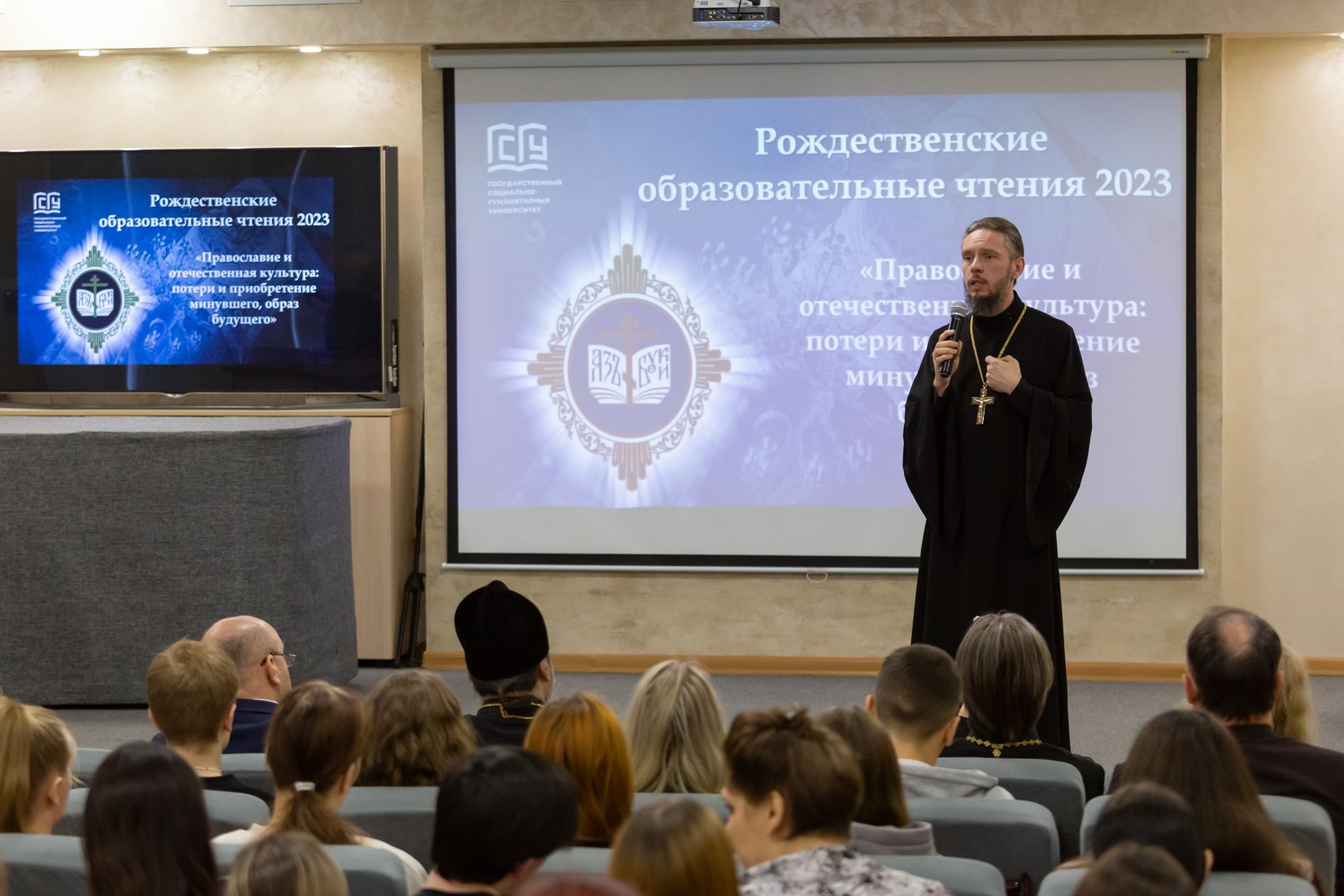 1 декабря 2023 года в Государственном социально-гуманитарном университете прошёл муниципальный этап Рождественских образовательных чтений «Православие и отечественная культура: потери и приобретение минувшего, и образ будущего». Более 60 участников – будущих учителей, представителей духовенства и преподавателей – собрались в конференц-зале, чтобы обсудить актуальные духовно-нравственные вопросы, а также вопросы, связанные с образованием, просвещением и воспитанием.