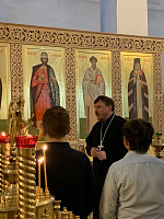 На примере святых и праведных Иоакима и Анны, родителей Пресвятой Богородицы, святого благоверного князя Александра Невского и великомученицы Екатерины отец Димитрий раскрыл понятие святости, затем ответил на вопросы школьников.