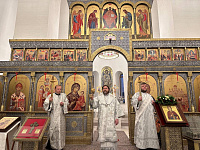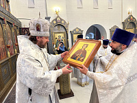 По окончании Божественной литургии с приветственным словом к архиепископу Фоме обратился настоятель храма иерей Александр Коновалов и в знак благодарности от настоятеля и прихожан храма преподнес икону вмч. Екатерины, после чего Владыка Фома обратился с Архипастырским словом к собравшимся