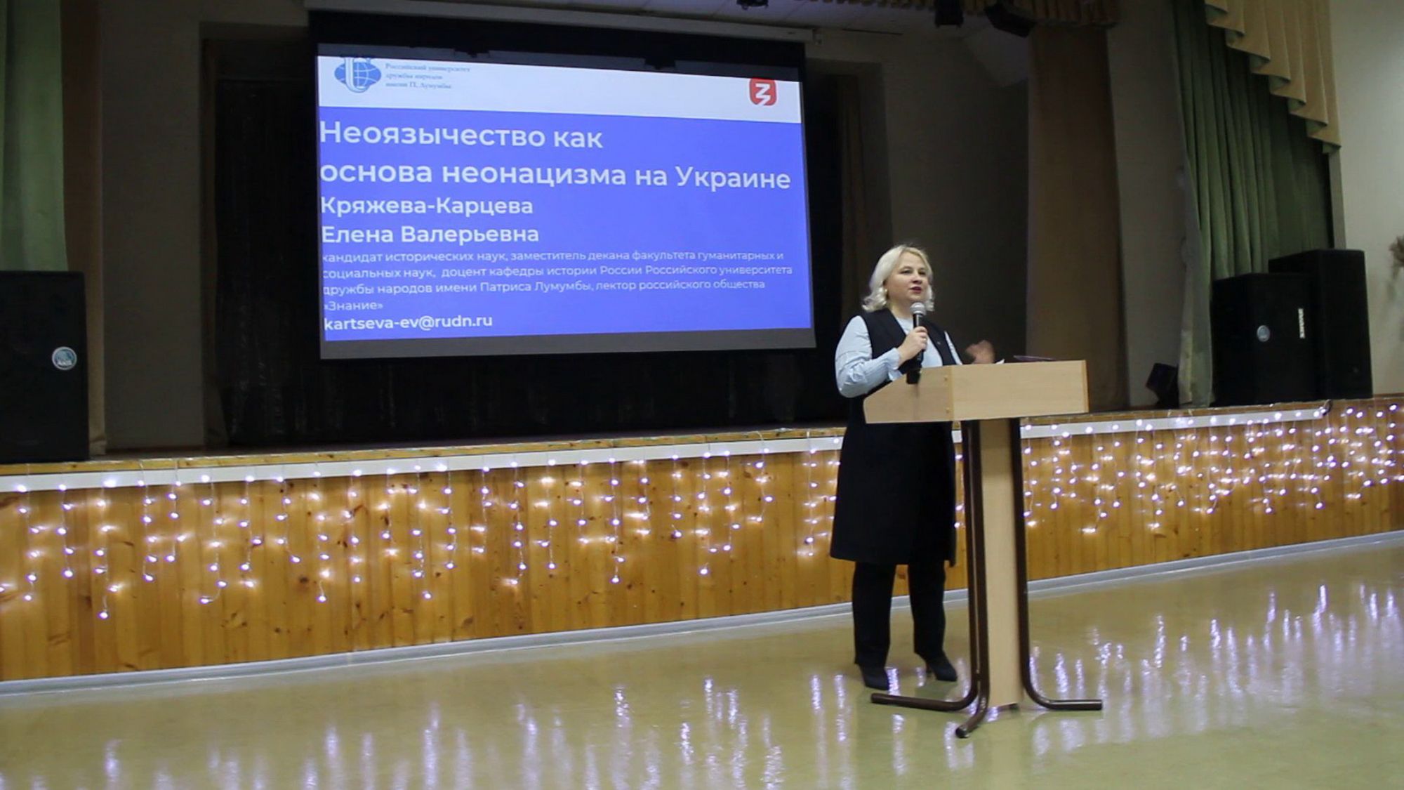 С докладом "Неоязычество как основа неонацизма на Украине" выступила гость мероприятия Елена Валерьевна Кряжева-Карцева - кандидат исторических наук, заместитель декана факультета гуманитарных и социальных наук, доцент кафедры истории России Российского университета Дружбы народов имени Патриса Лумумбы, лектор российского общества "3нание".