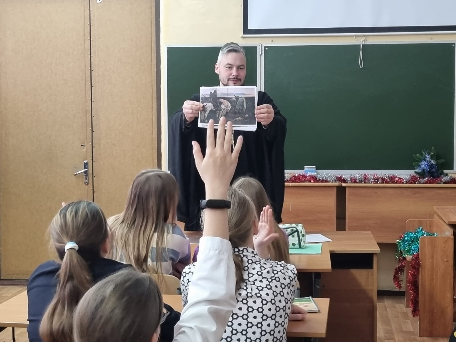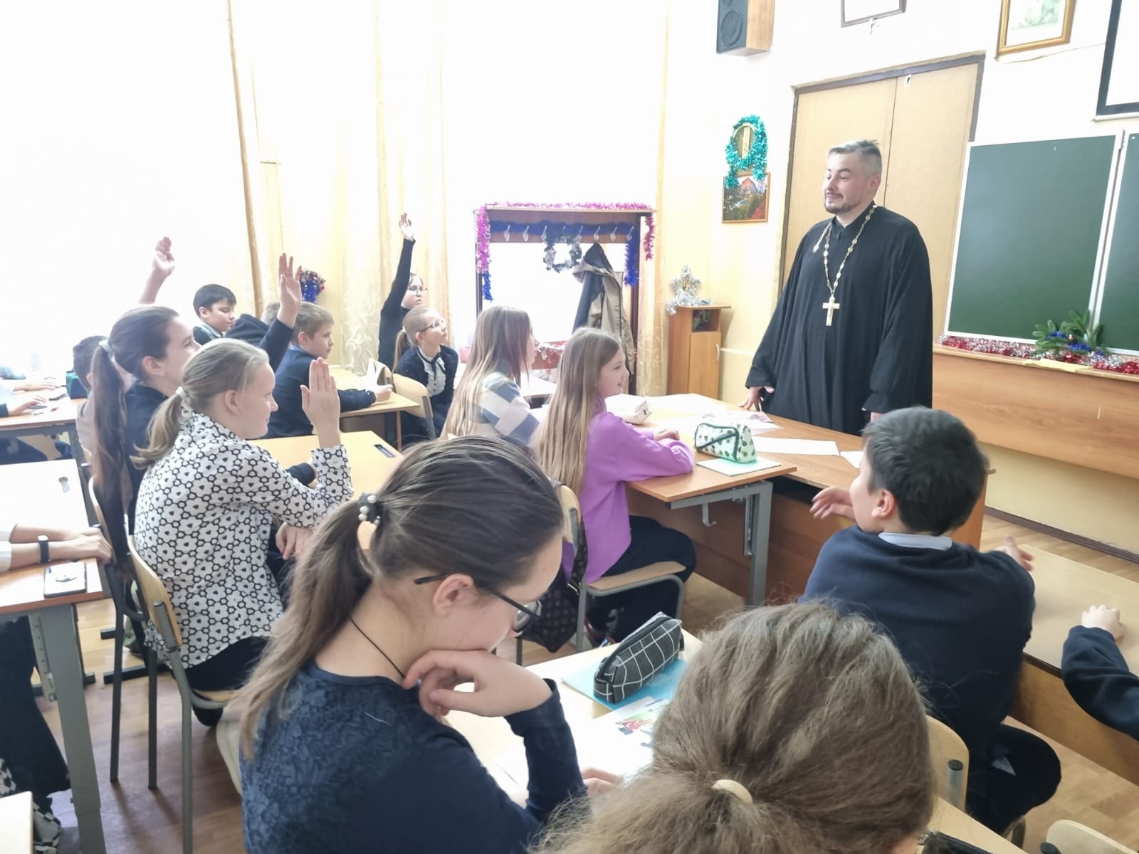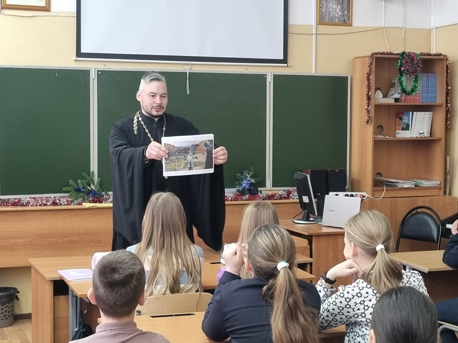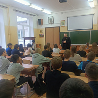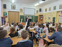 14 декабря 2023 года клирик Владимирского храма г. Мытищи иерей Георгий Соколов провел открытый урок для учеников пятых классов Первой гимназии города Мытищи. По просьбе учителей темой для разговора стало обсуждение духовного подвига в творчестве русских художников. Пятиклассники с интересом слушали интересный доклад и активно принимали участие в обсуждении.