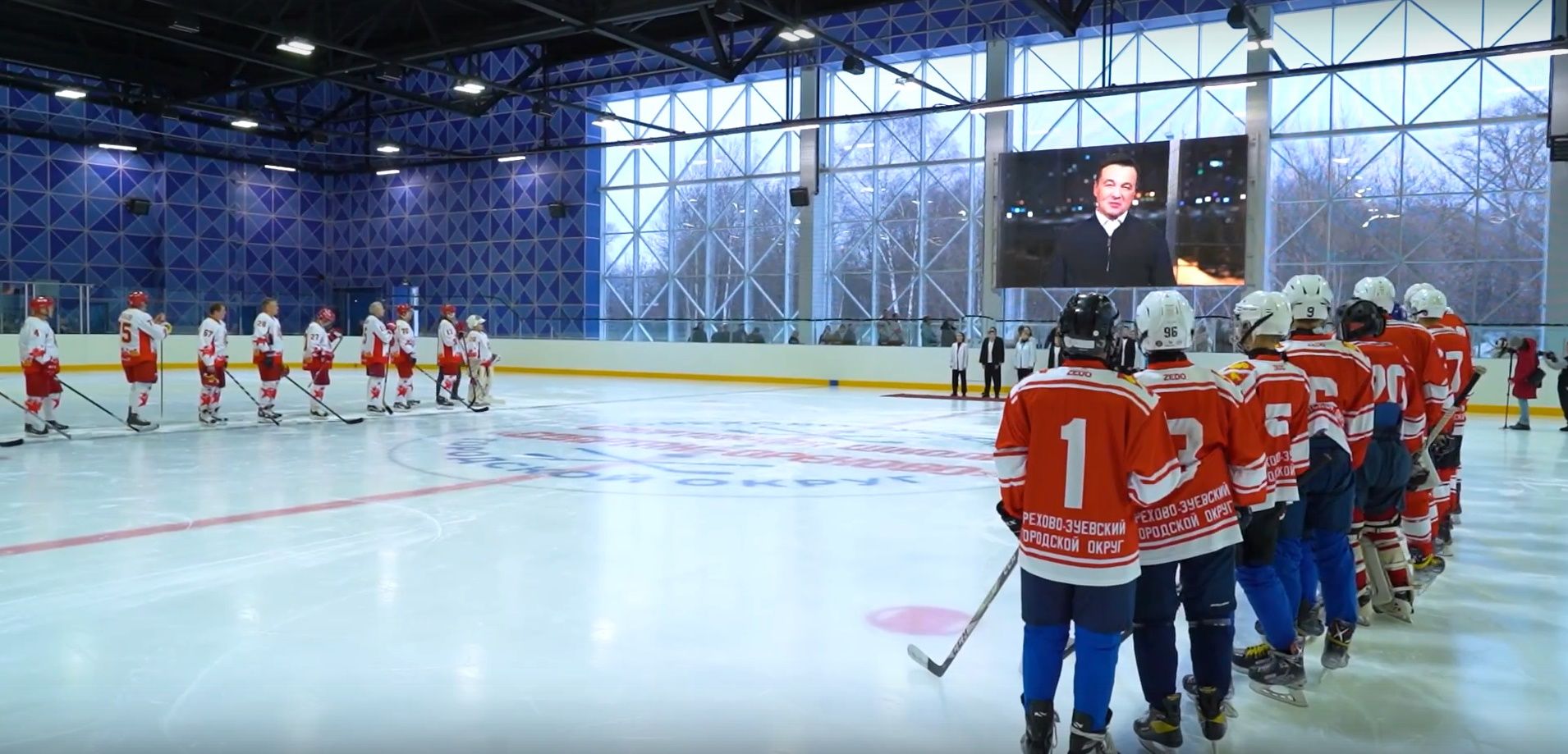 Затем состоялся первый хоккейный матч на вновь сооружённой арене между командой Орехово-Зуевского городского округа и сборной командой легенд Российского хоккея.