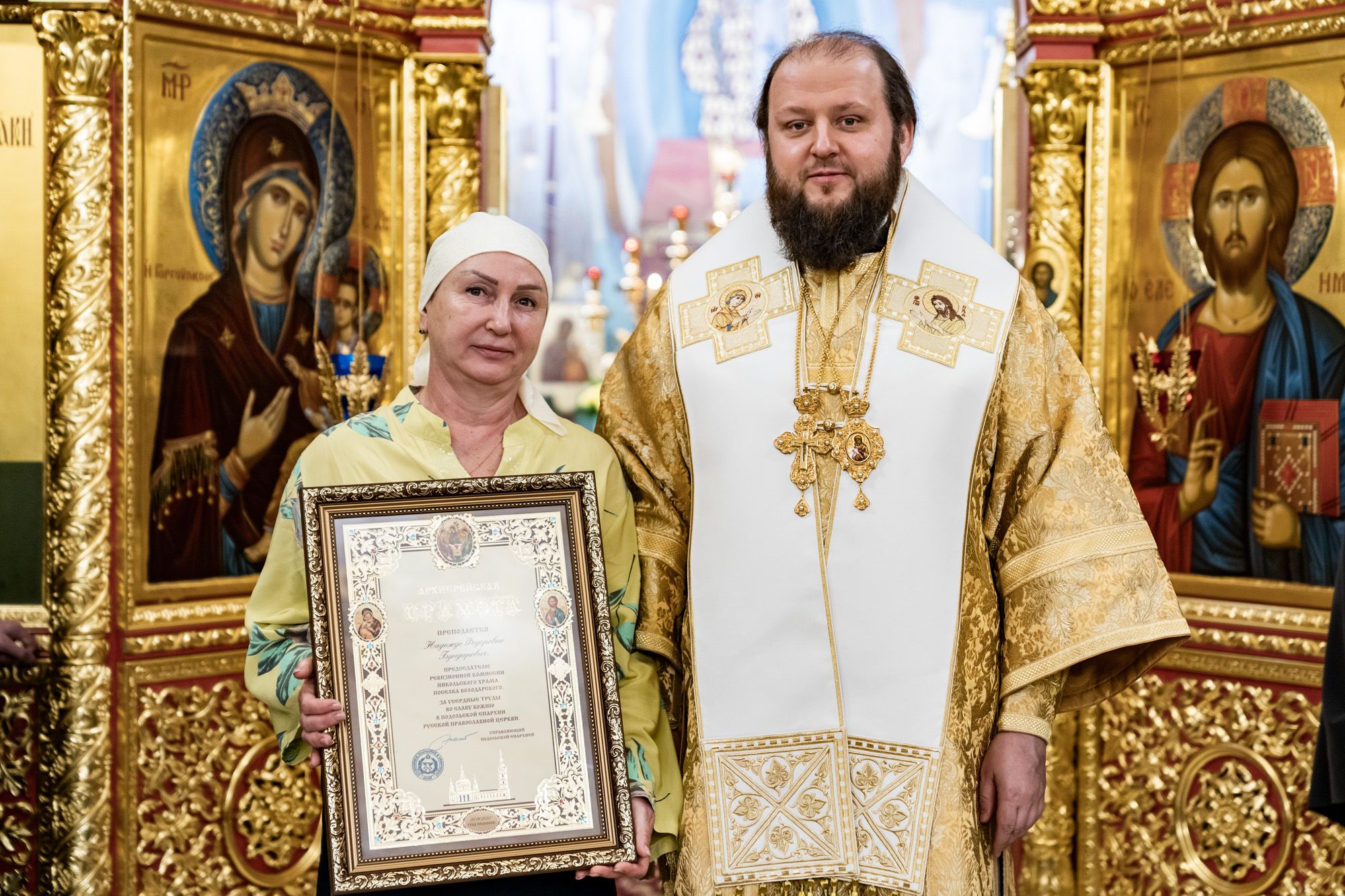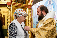 Далее архиепископ Аксий вручил старосте Никольского храма О.А.Котельниковой орден преподобного Варлаама Серпуховского III степени и Архиерейские грамоты прихожанам храма.