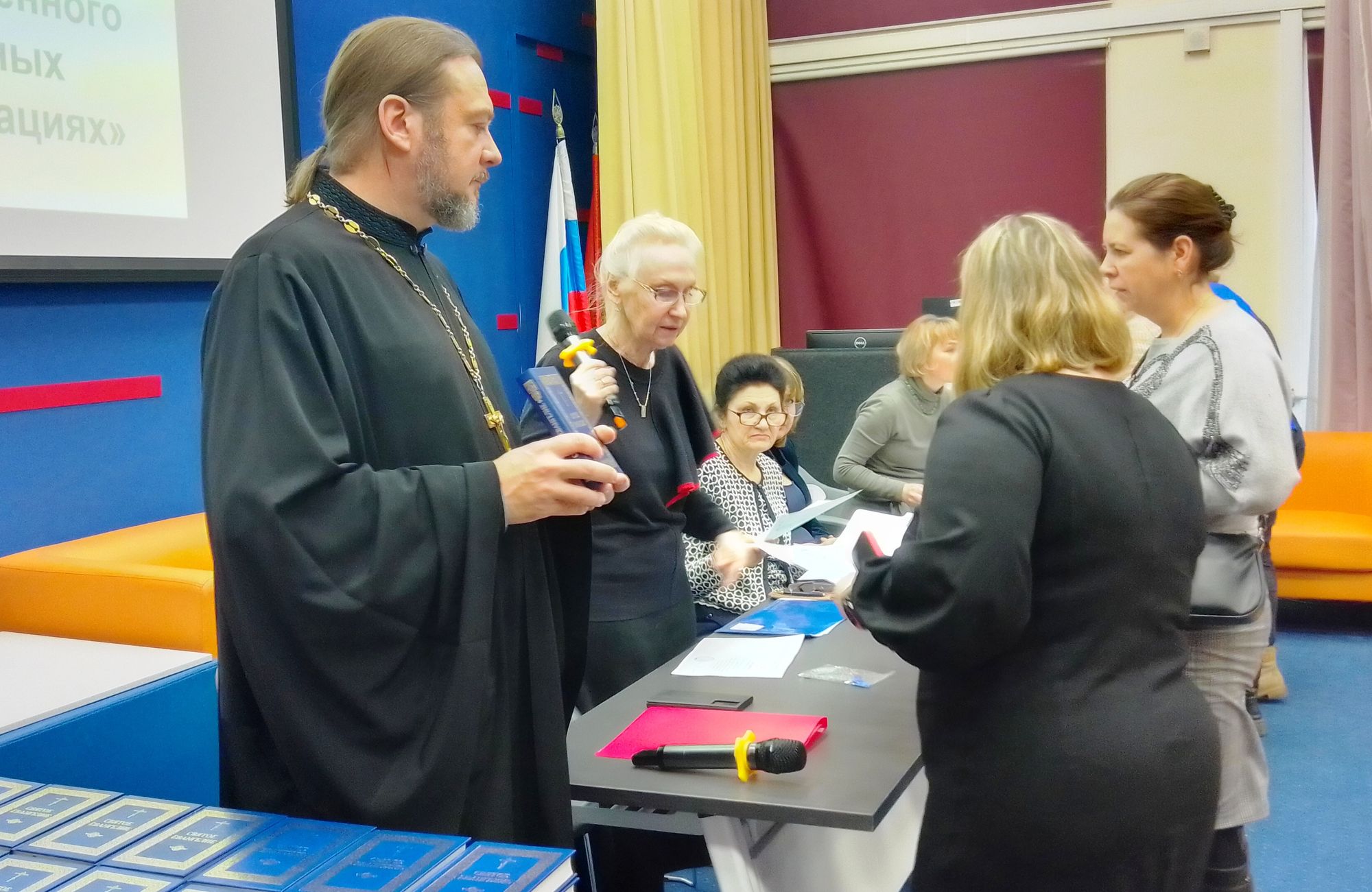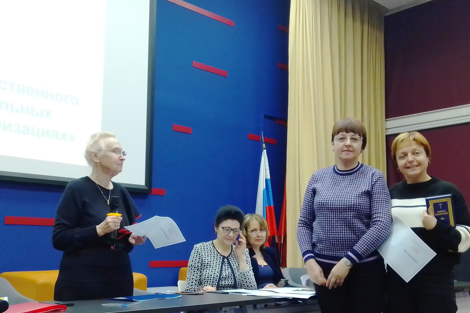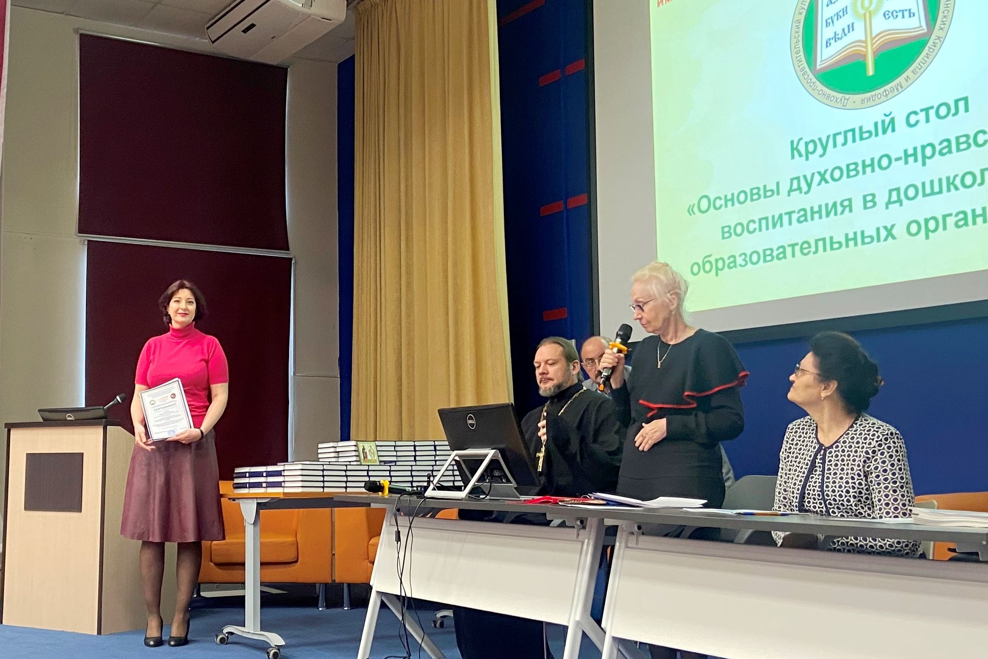 По завершении Круглого стола состоялась торжественная выдача удостоверений о повышении квалификации педагогам дошкольных образовательных учреждений Московской области, успешно закончившим курсы по программе «Добрый мир. Основы духовно-нравственного воспитания в дошкольных образовательных организациях в контексте ФГОС ДО». Все выпускники получили в подарок Святое Евангелие, переданное по благословению митрополита Крутицкого и Коломенского Павла. На курсах, проходивших с 4 октября по 20 декабря 2023 года, были подготовлены 242 педагога из 39 территорий Московской области.