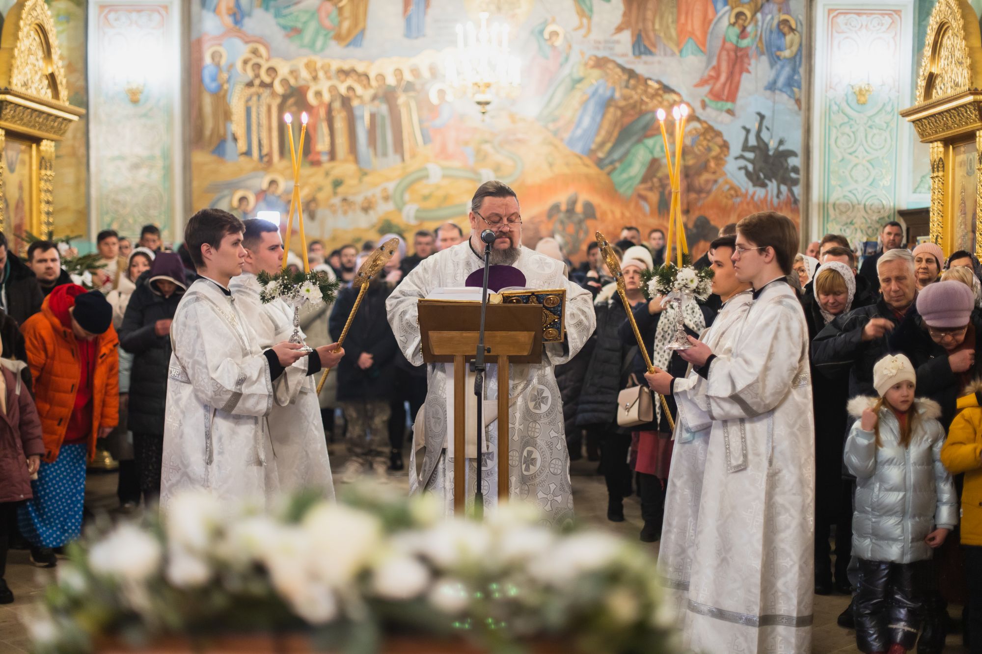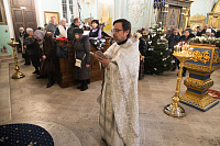 По запричастном стихе клирик собора иерей Алексий Платоненков зачитал Рождественское послание митрополита Крутицкого и Коломенского Павла, Патриаршего Наместника Московской митрополии.