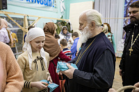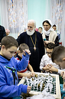 Затем Владыка в приходском доме осмотрел выставку фотографий о приходской жизни пообщался с волонтёрами объединения «Жуковяз».
