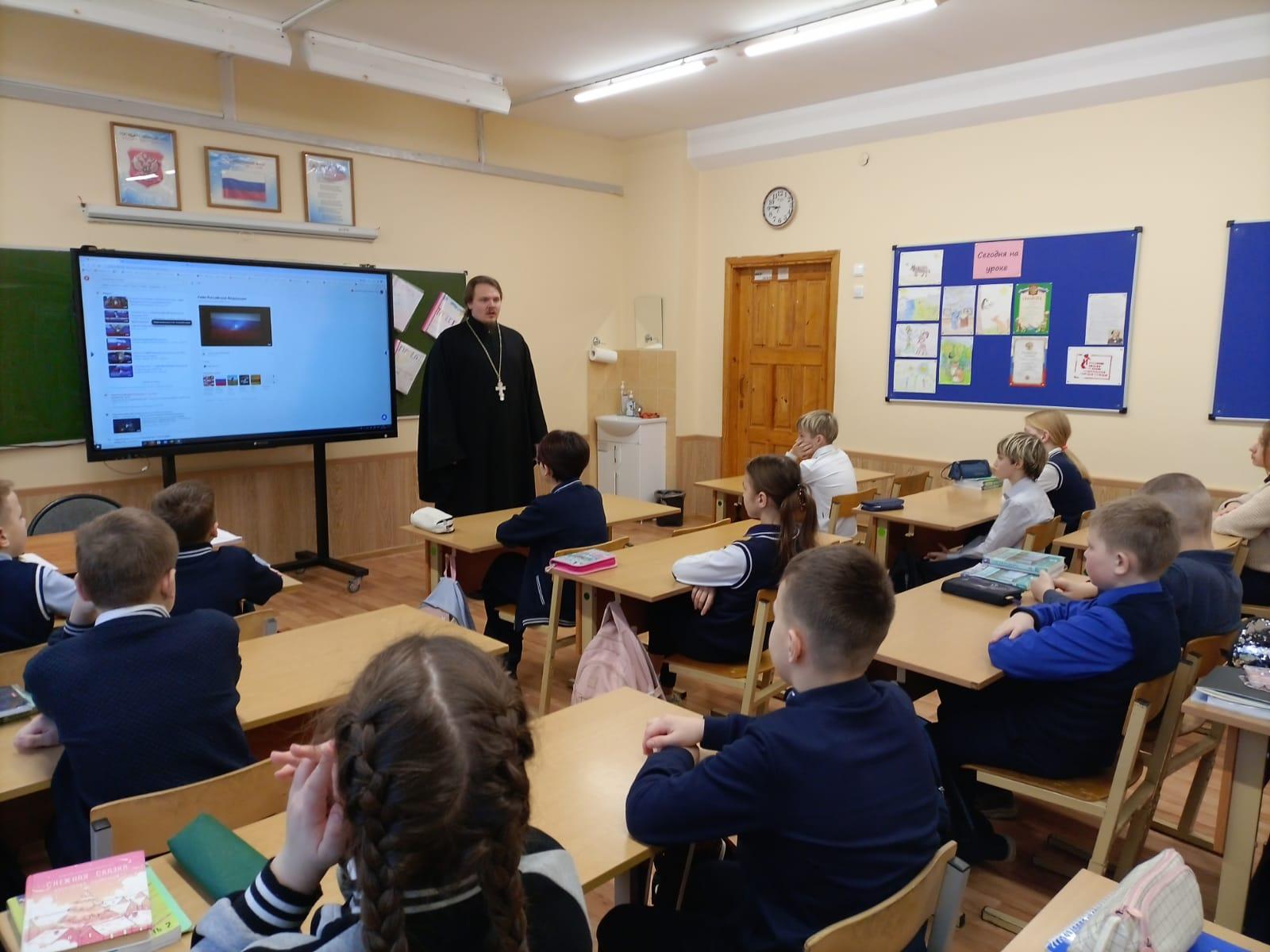 29 января настоятель Скорбященского храма деревни Ассаурово иерей Иннокентий Шишов посетил Яхромскую СОШ № 1 и провел урок для учеников 5 "А" класса.