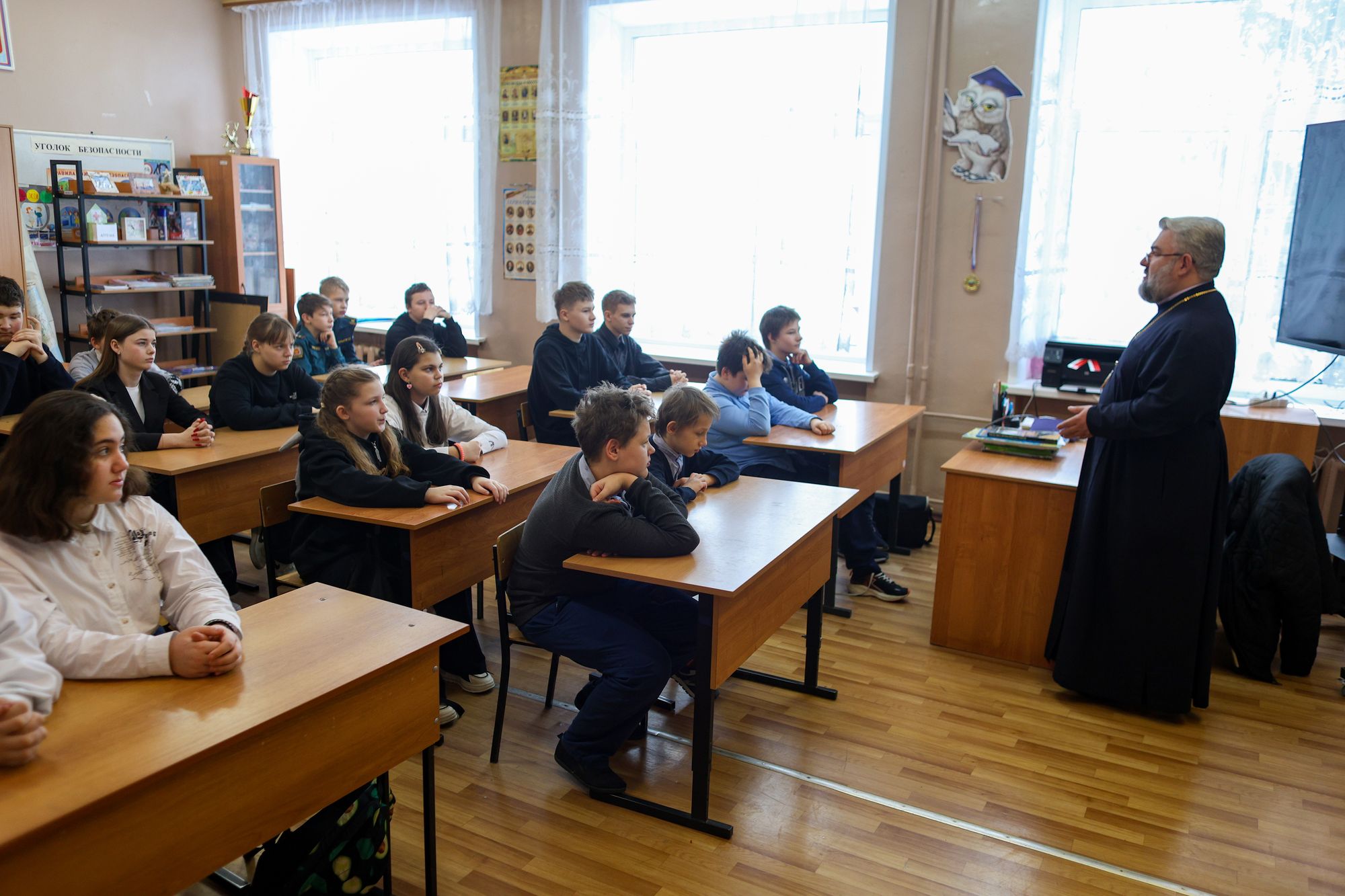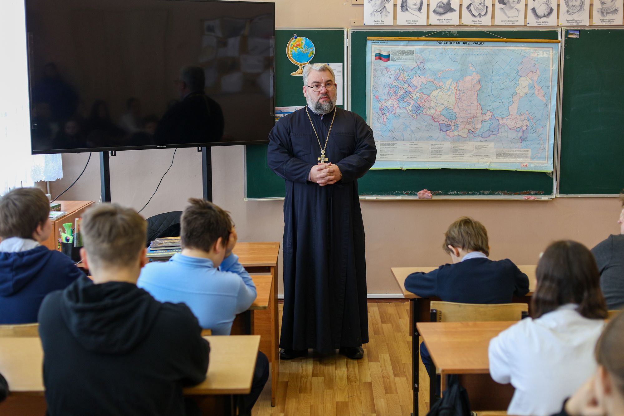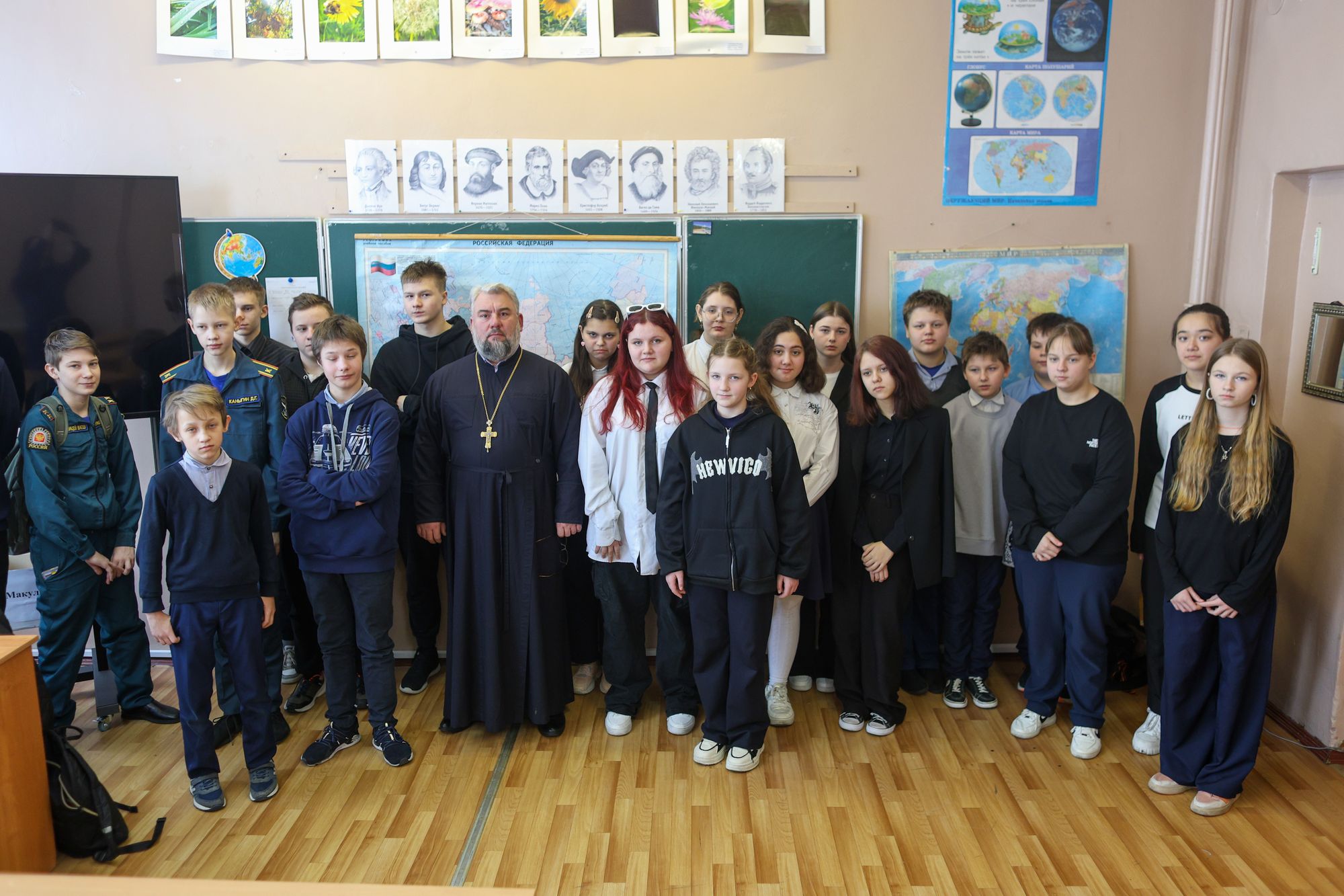 16 февраля, в рамках областного совместного проекта Министерства образования Московской области и Коломенской епархии - «Задай вопрос священнику», благочинный 2-го Воскресенского благочиннического округа, настоятель Вознесенского храма с. Барановское протоиерей Сергий Рыбаков встретился с учащимися 6-х и 8-х классов МБОУ-Лицея «Воскресенская кадетская школа» с. Усадище.