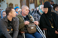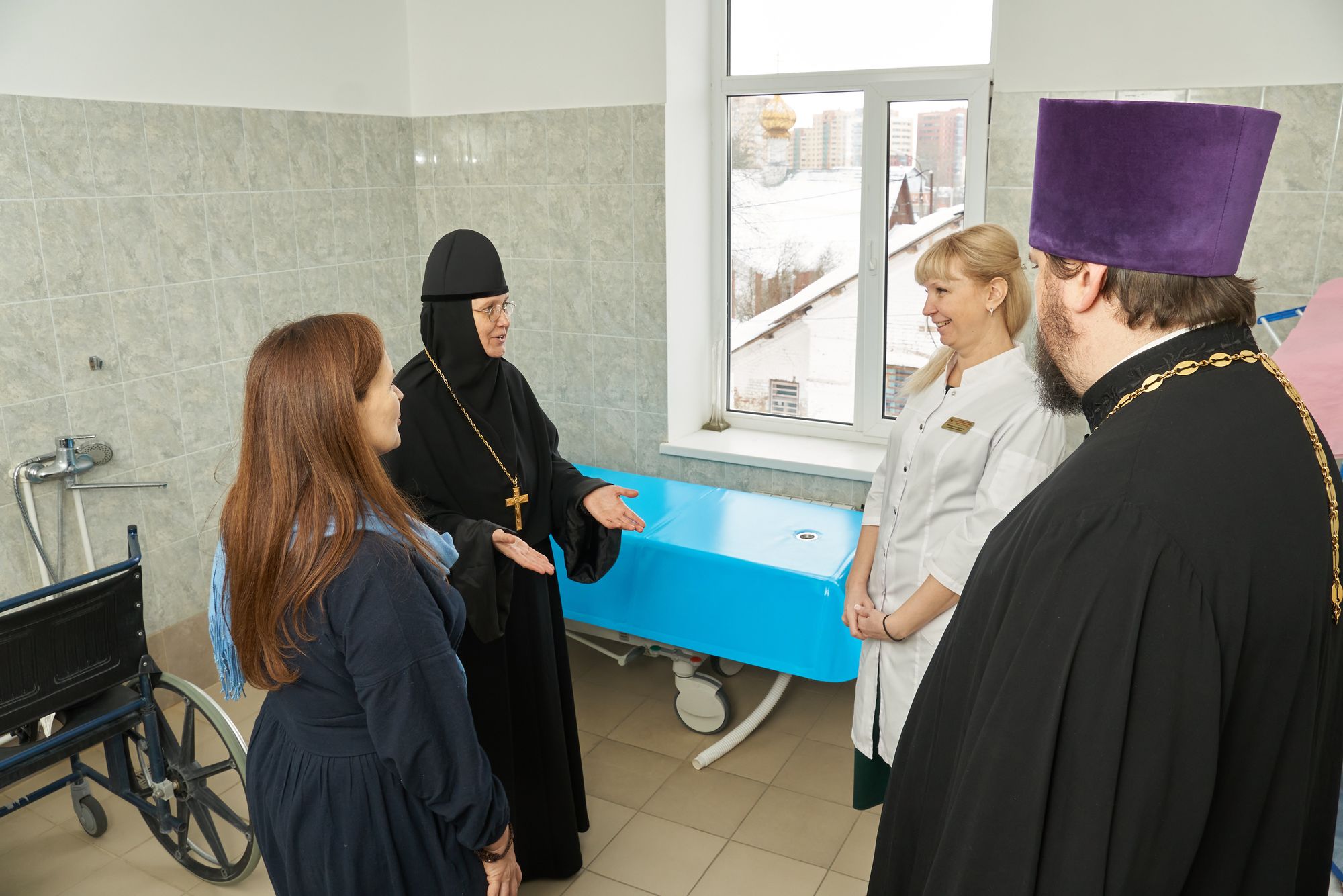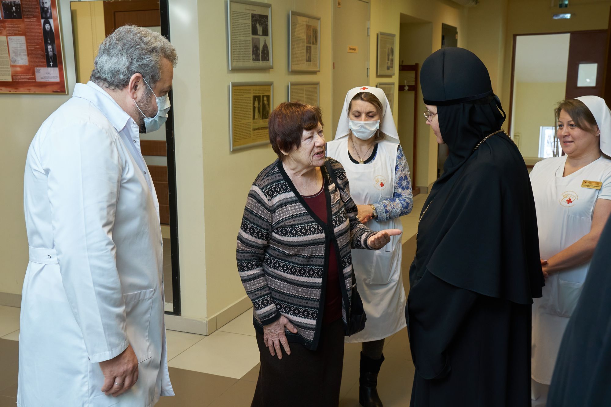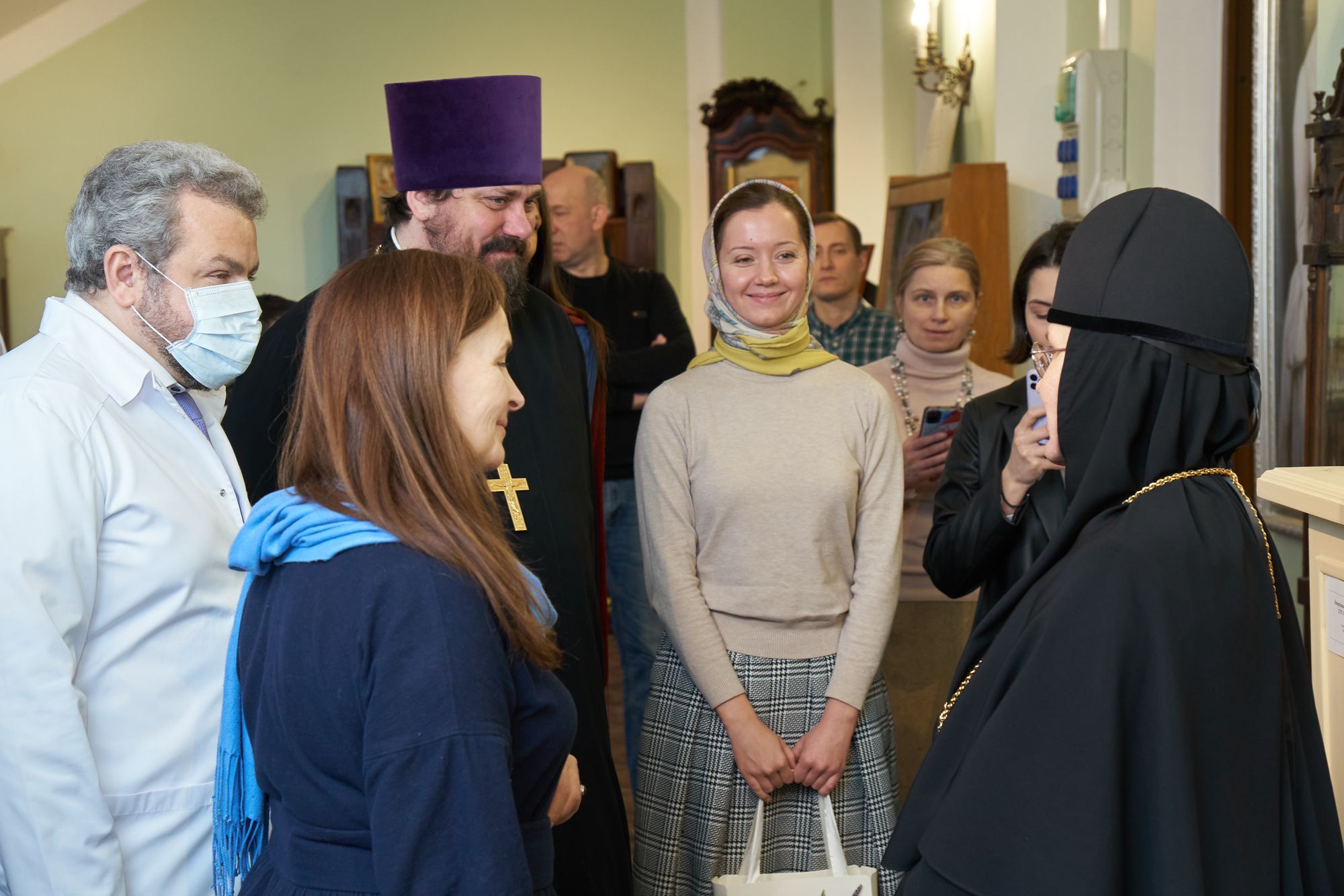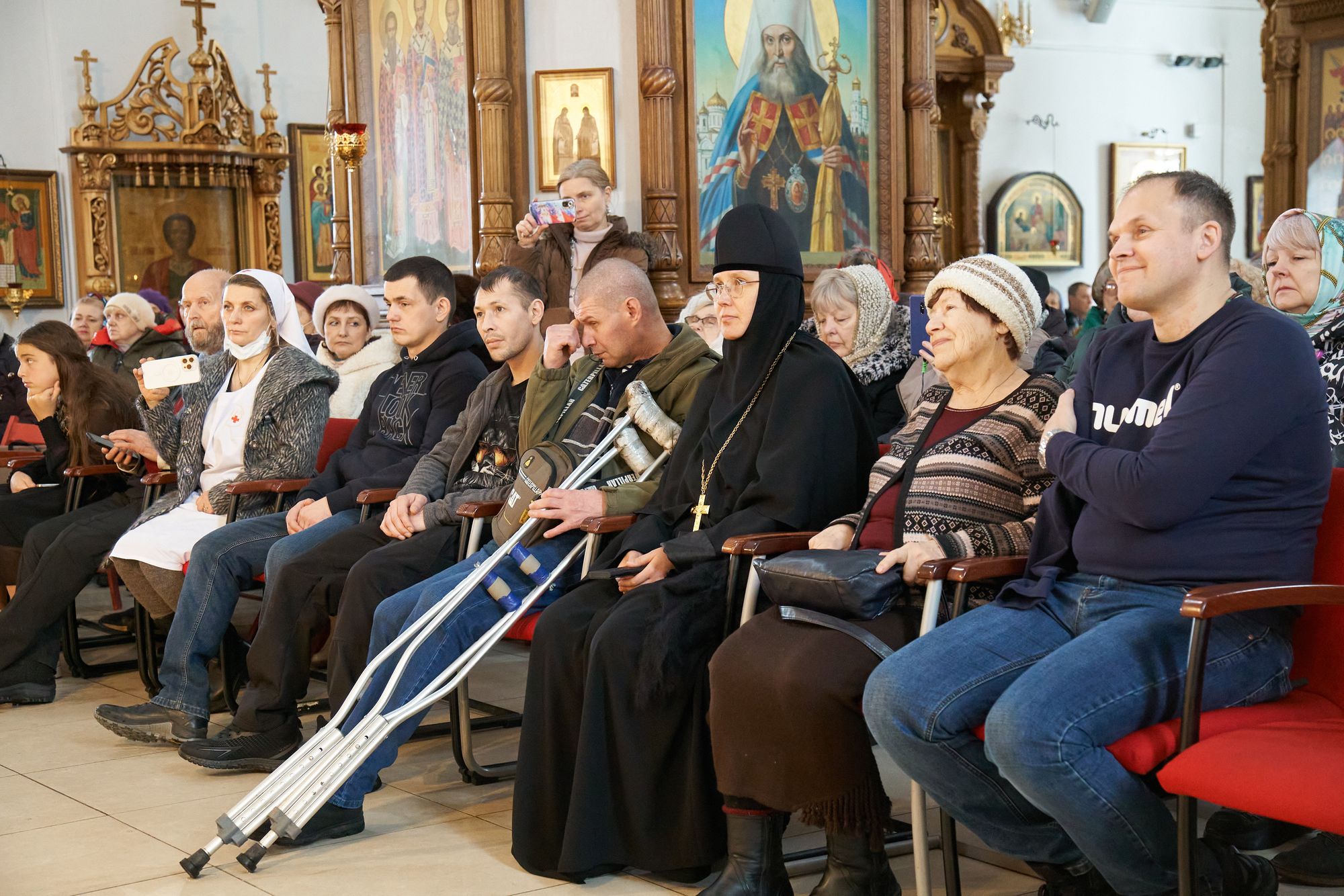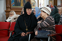 Праздничная программа началась в Елизаветинском филиале Больницы Святителя Алексия, расположенном на территории Пантелеимоновского прихода. Сюда в этот особый день для нашего Отечества приехала игумения Марфо-Мариинской обители сестёр милосердия Елизавета, чтобы поздравить воинов СВО, проходящих здесь реабилитацию и протезирование.