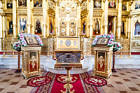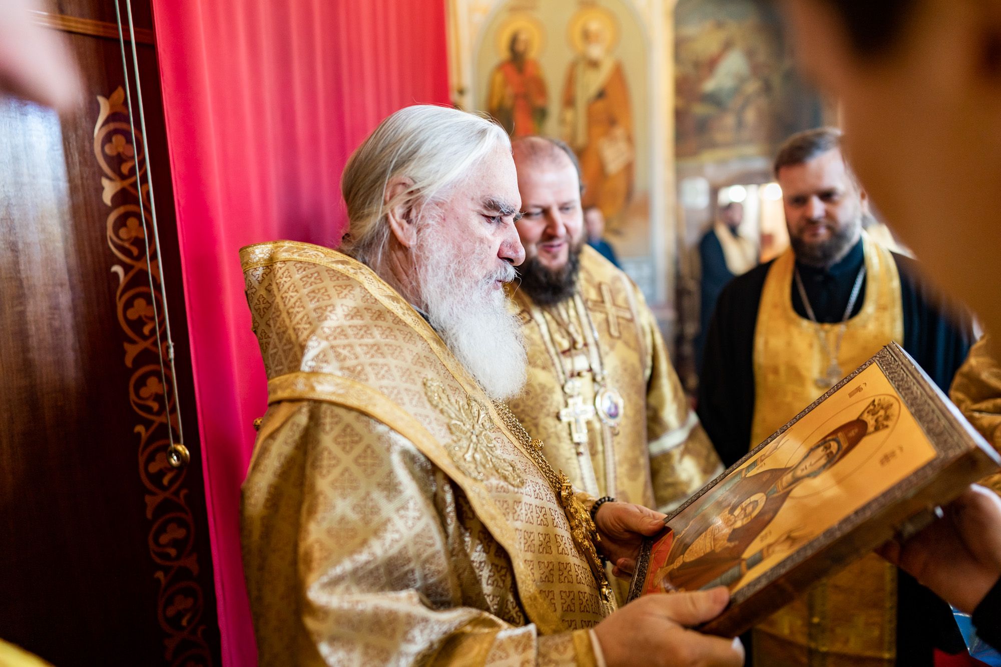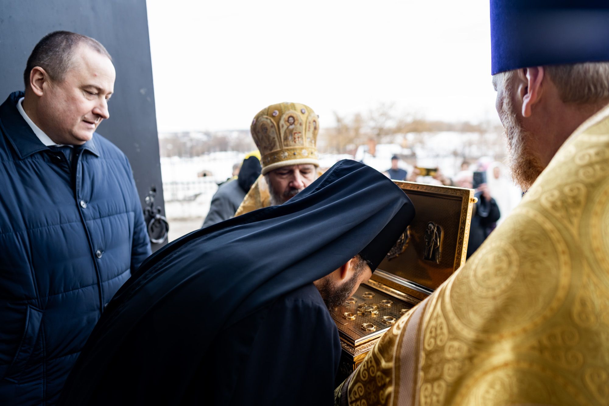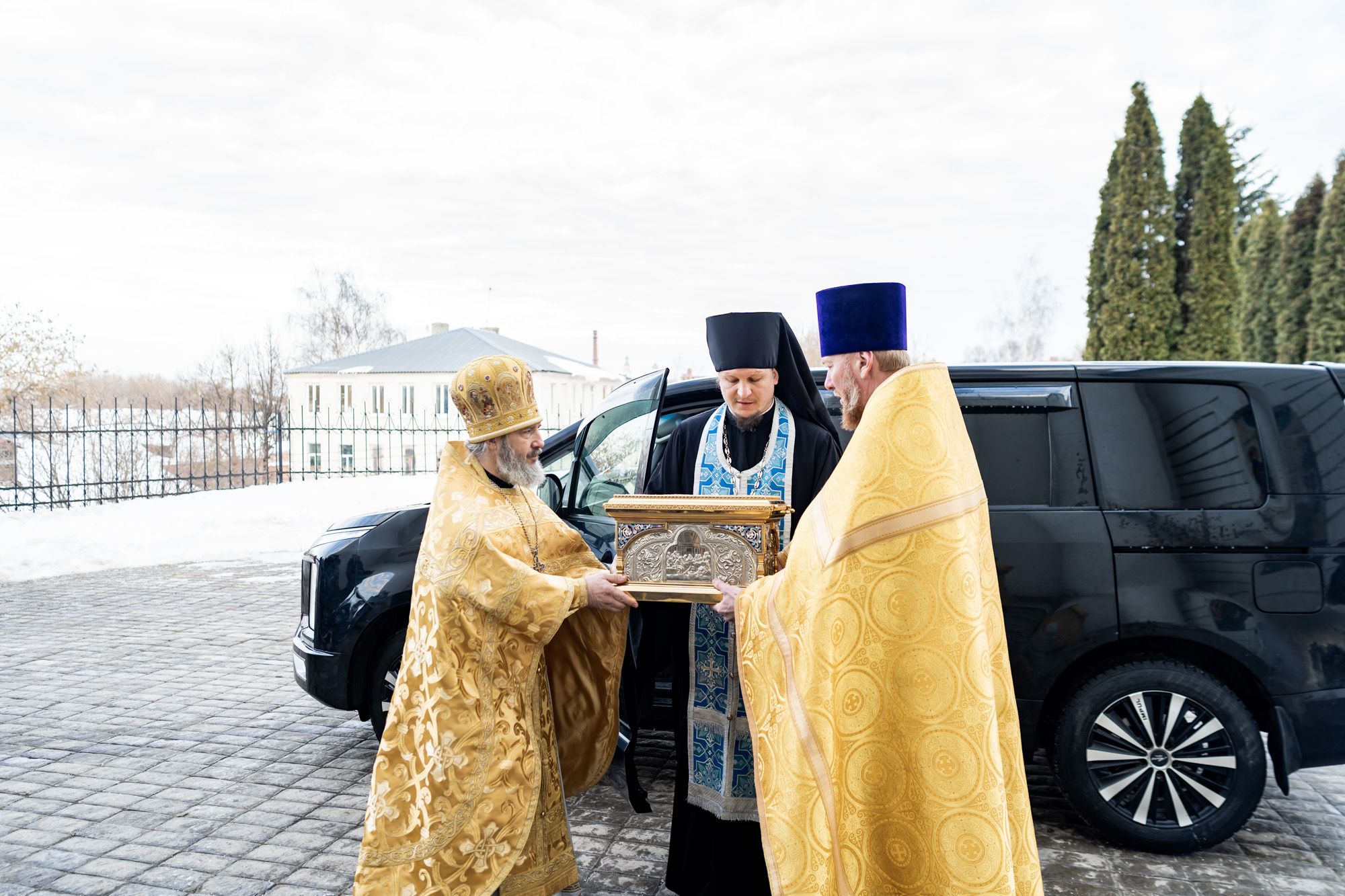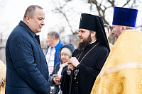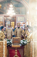 Перед началом богослужения архиепископ Аксий и С.Н. Никитенко встретили ковчег с частицей мощей святителя Иоанна Златоуста.