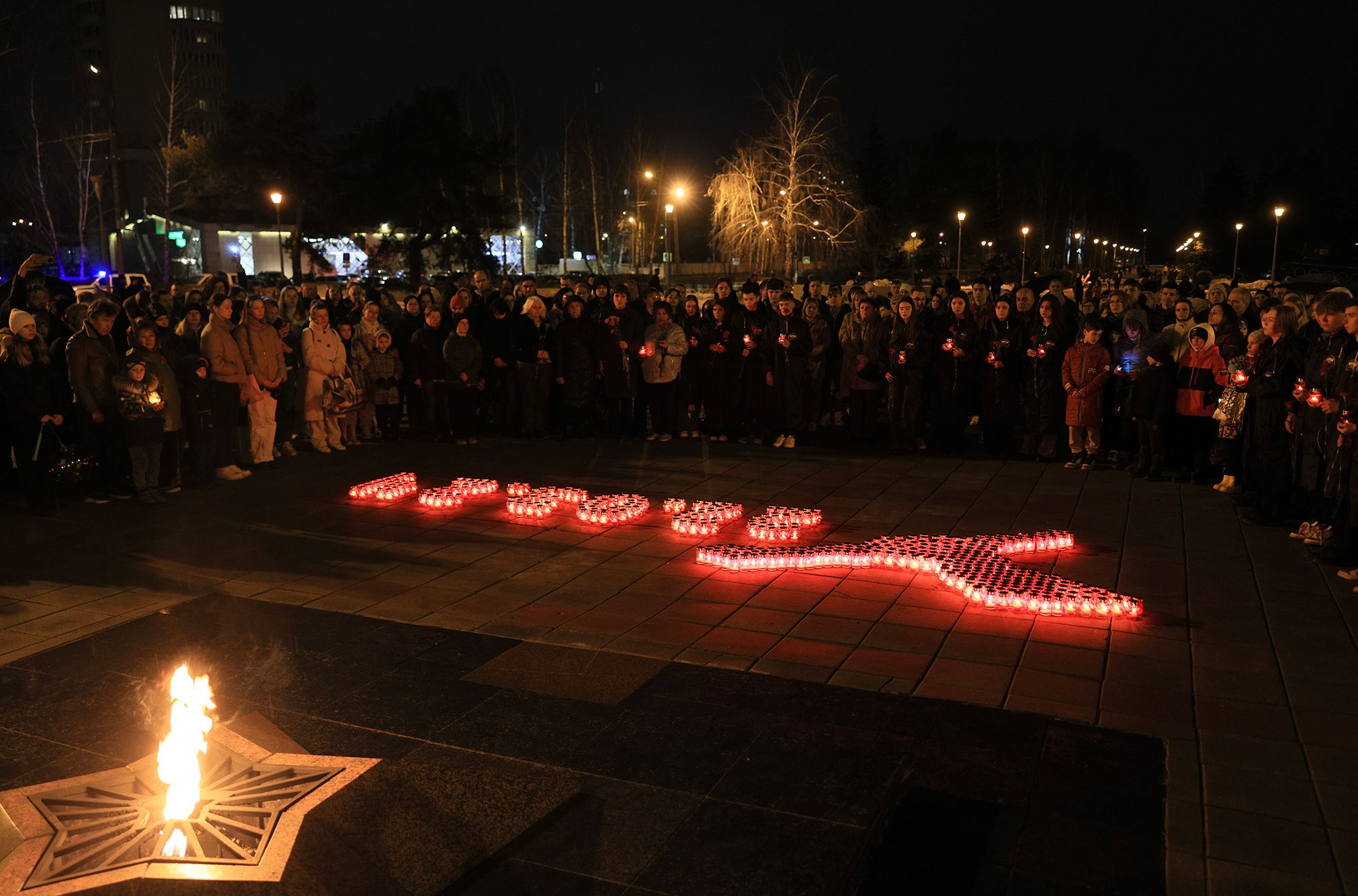 На плитах Мемориала Славы волонтеры выложили из алых свечей фигуру журавля, который стал символом этого страшного события, и дату, которая навсегда останется в нашей памяти.