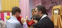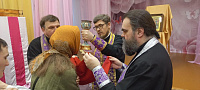 Помимо воспитателей и учителей детского дома священникам помогали девушки из центра «Милосердие», действующего при Свято-Духовском храме деревни Дубровки. Сестры готовили и раздавали просфоры и запивку, читали молитвенное правило перед Святым Причащением, беседовали с детьми.
