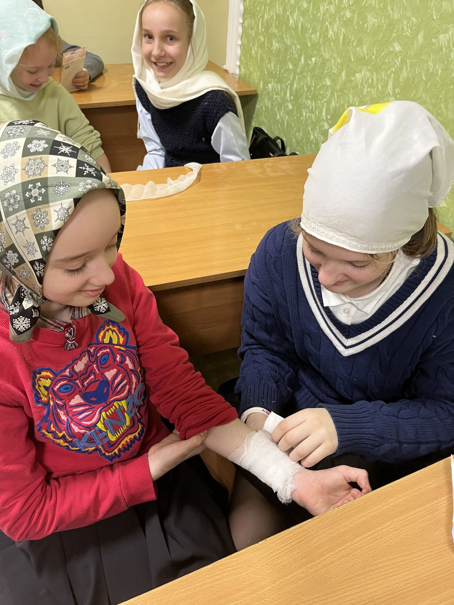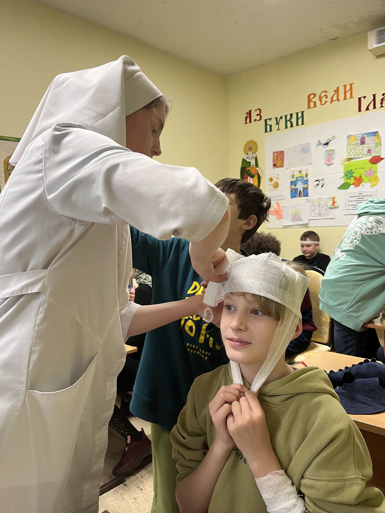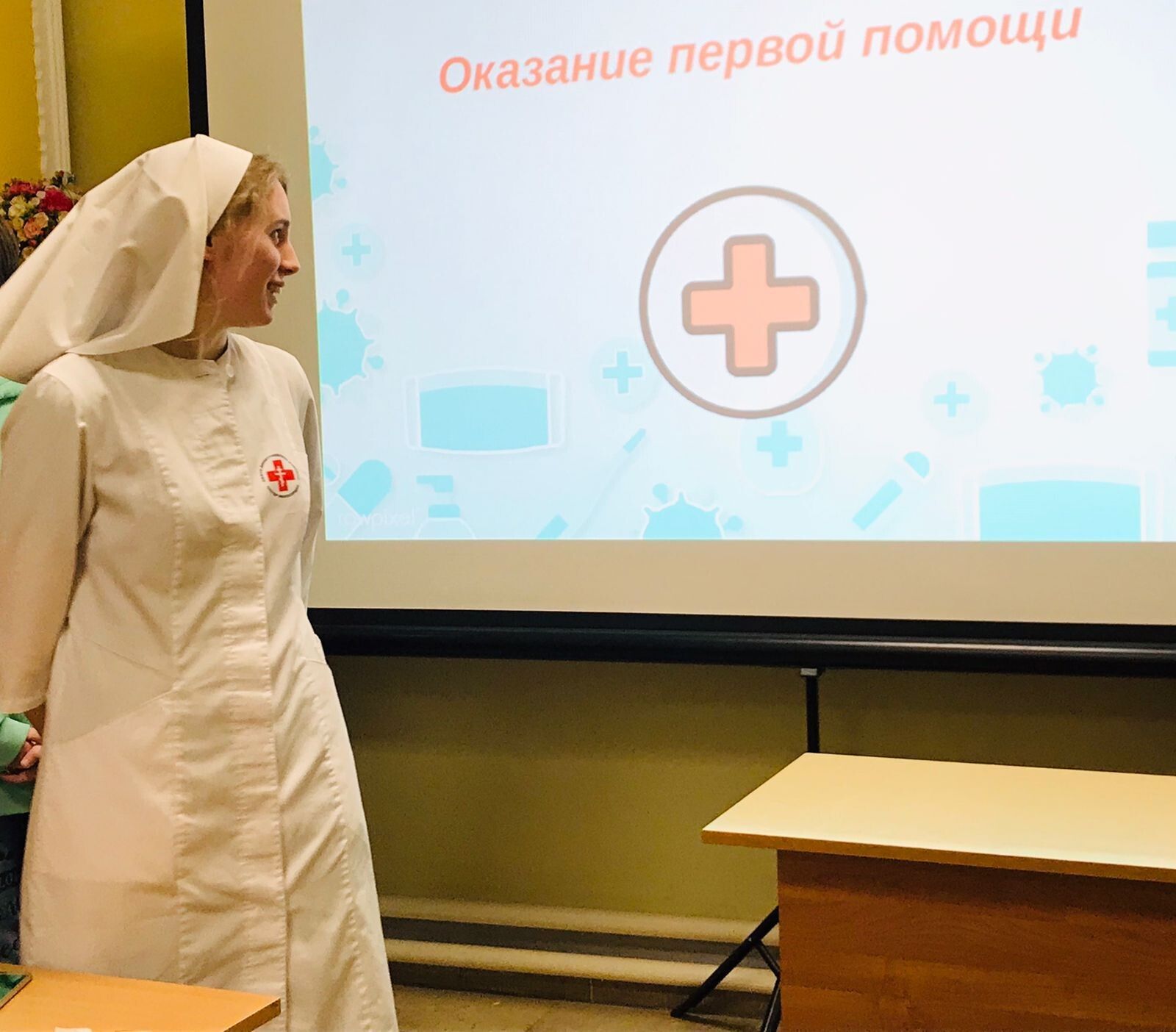14 апреля по окончании Божественной литургии в воскресной школе Георгиевского прихода города Долгопрудный студентка Свято-Димитриевского училища сестер милосердия в Москве Елизавета Винокурова провела инструктаж об оказании первой помощи пострадавшему.
