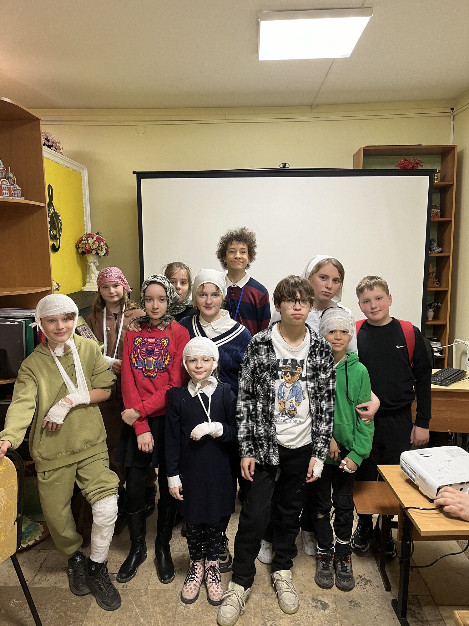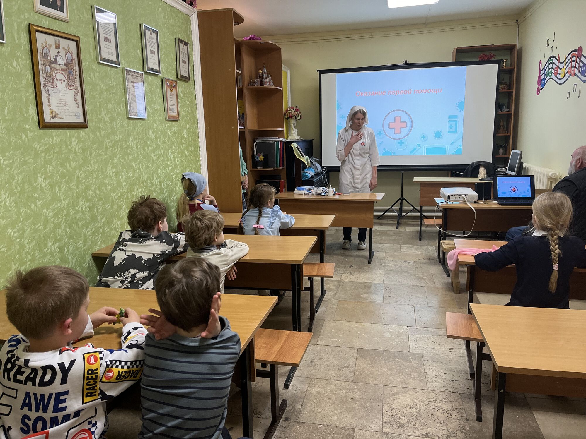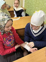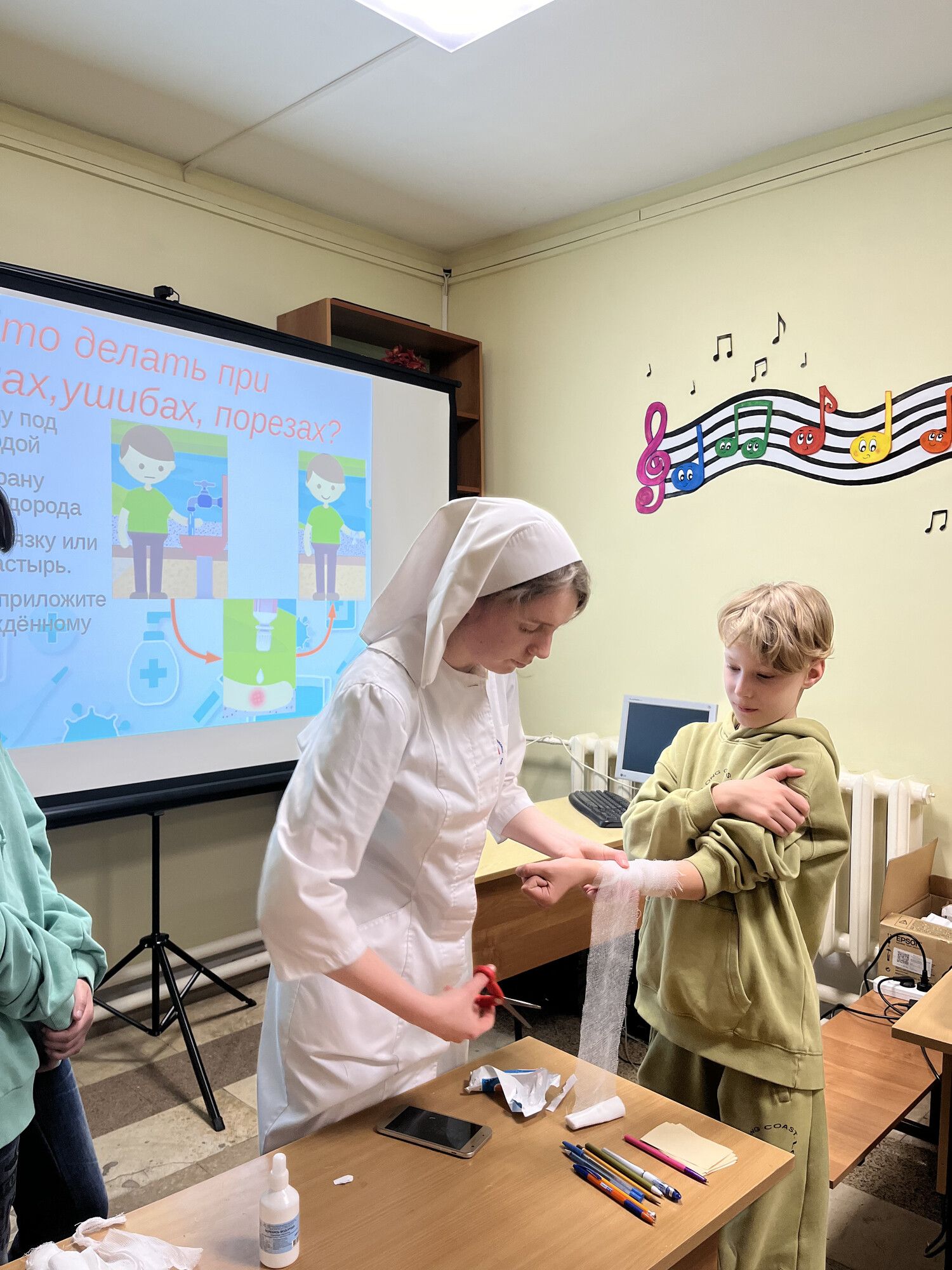 14 апреля по окончании Божественной литургии в воскресной школе Георгиевского прихода города Долгопрудный студентка Свято-Димитриевского училища сестер милосердия в Москве Елизавета Винокурова провела инструктаж об оказании первой помощи пострадавшему.