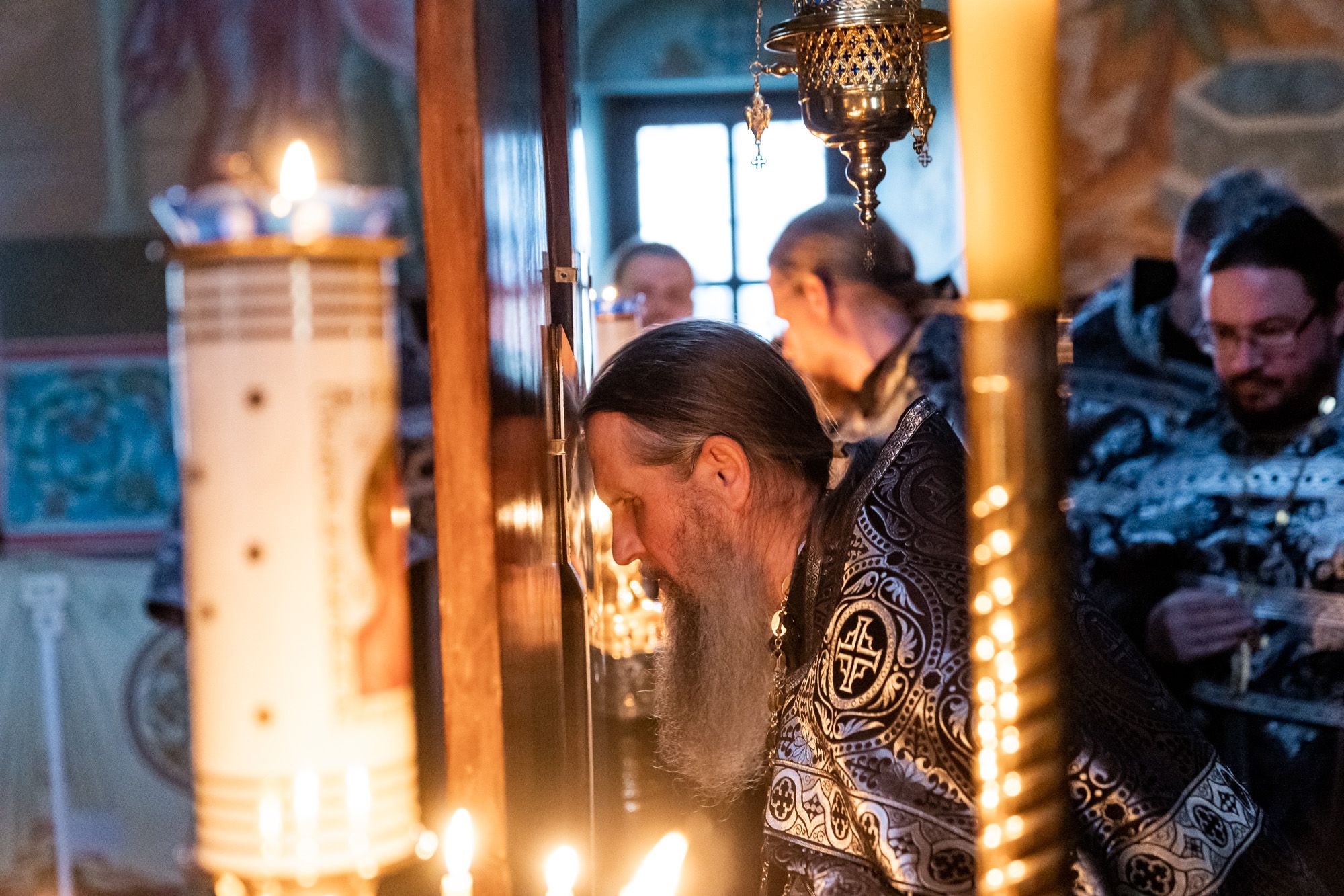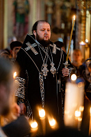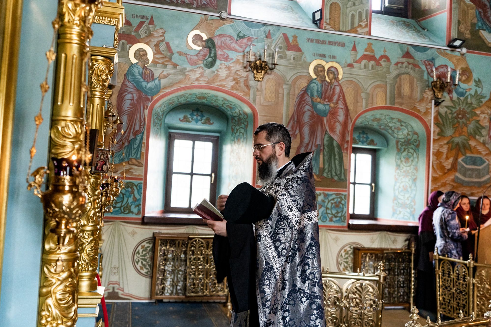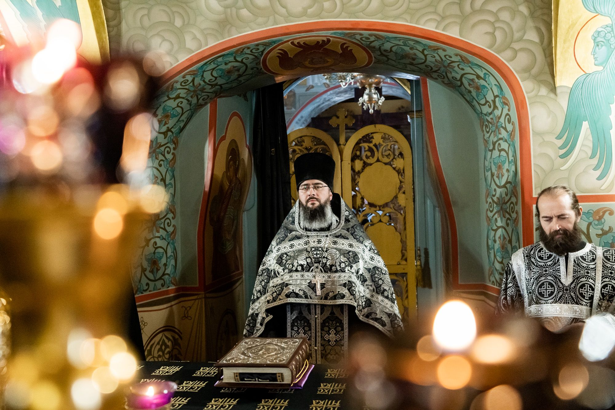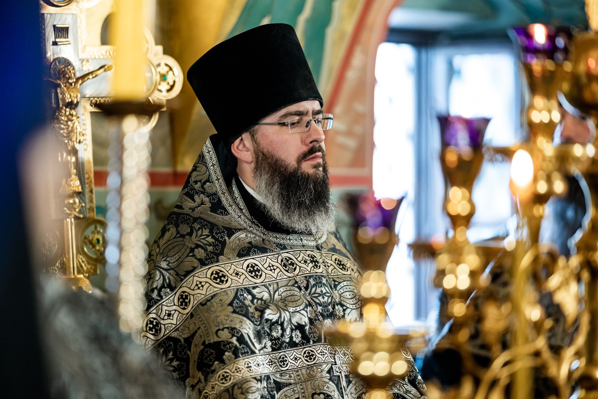 14 апреля вечером архиепископ Подольский и Люберецкий Аксий совершил вечерню с чтением акафиста Страстям Христовым в Зачатьевском храме города Чехова.