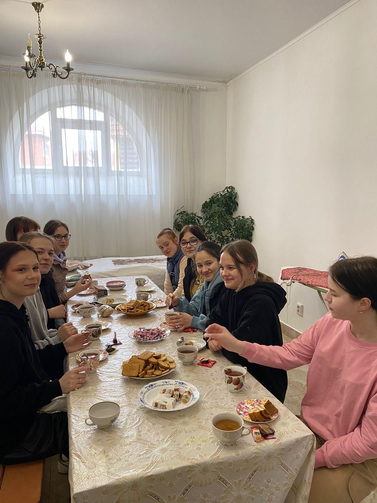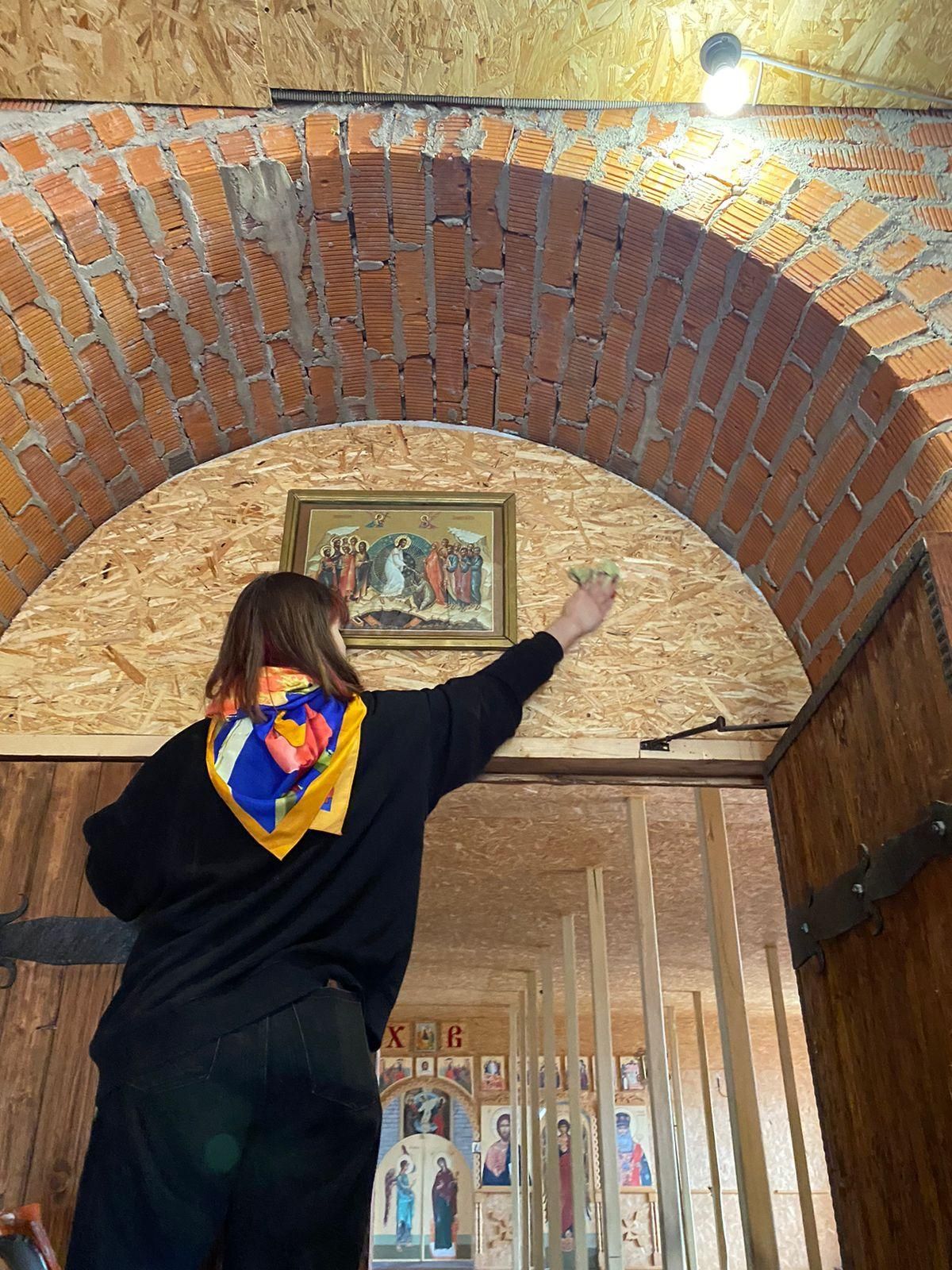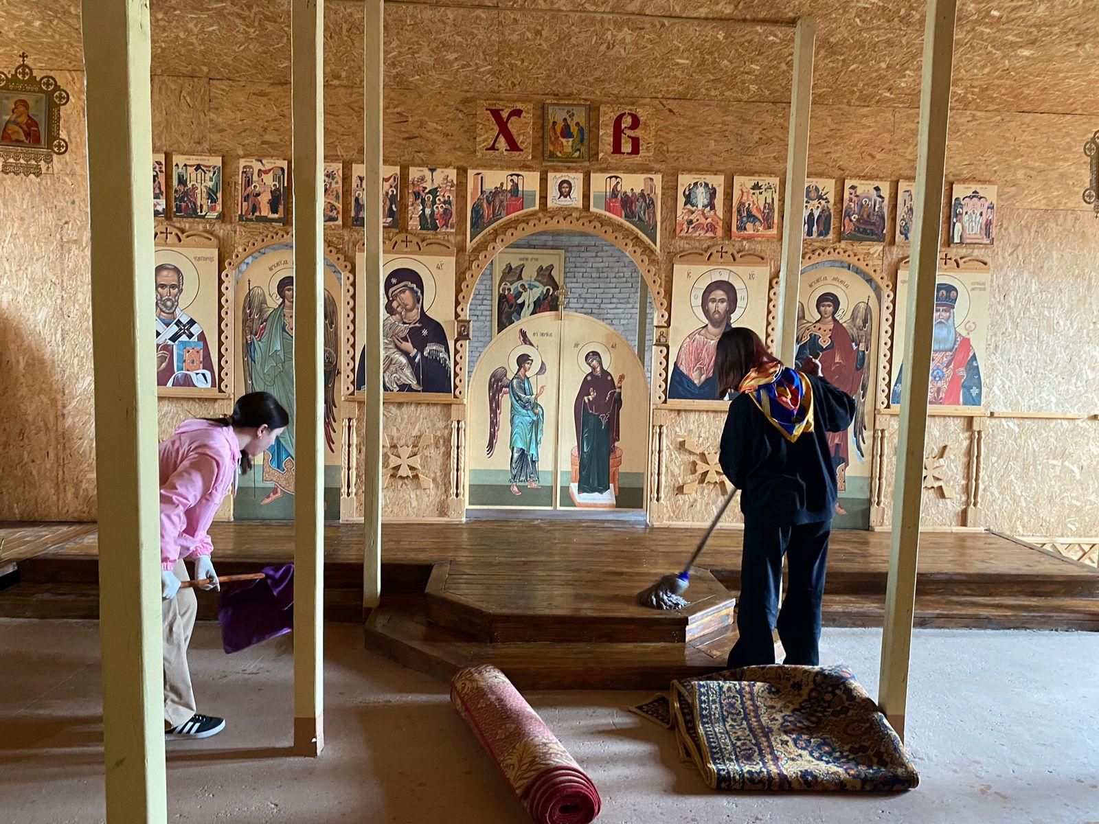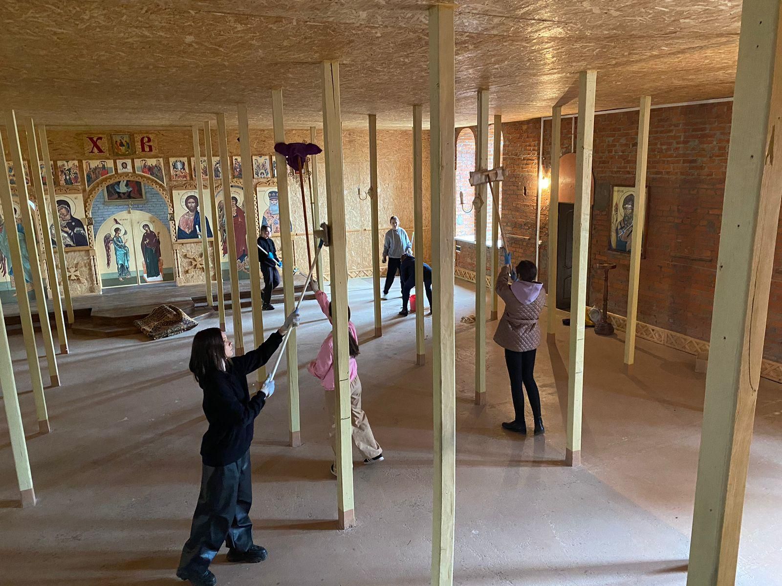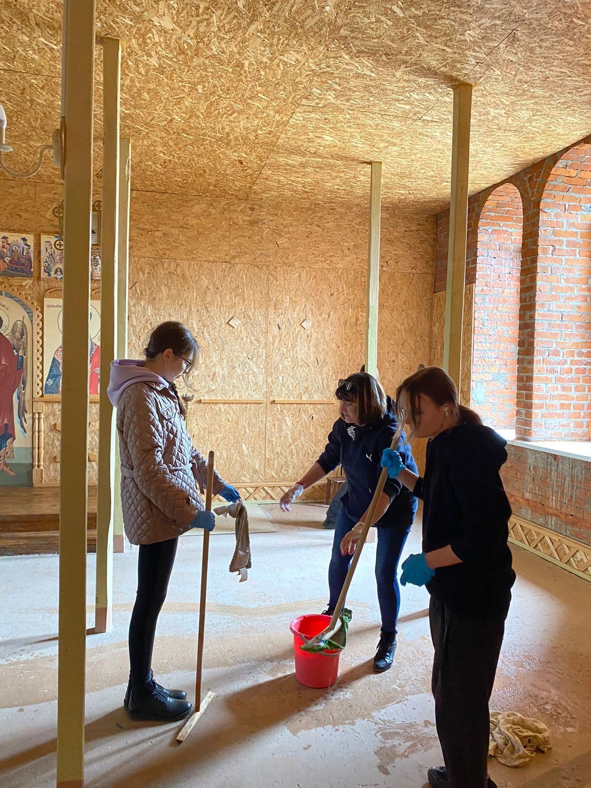 Школьники старательно вымыли полы, стены, окна. В перспективе в теплое время года богослужения будут совершаться в верхнем храме.