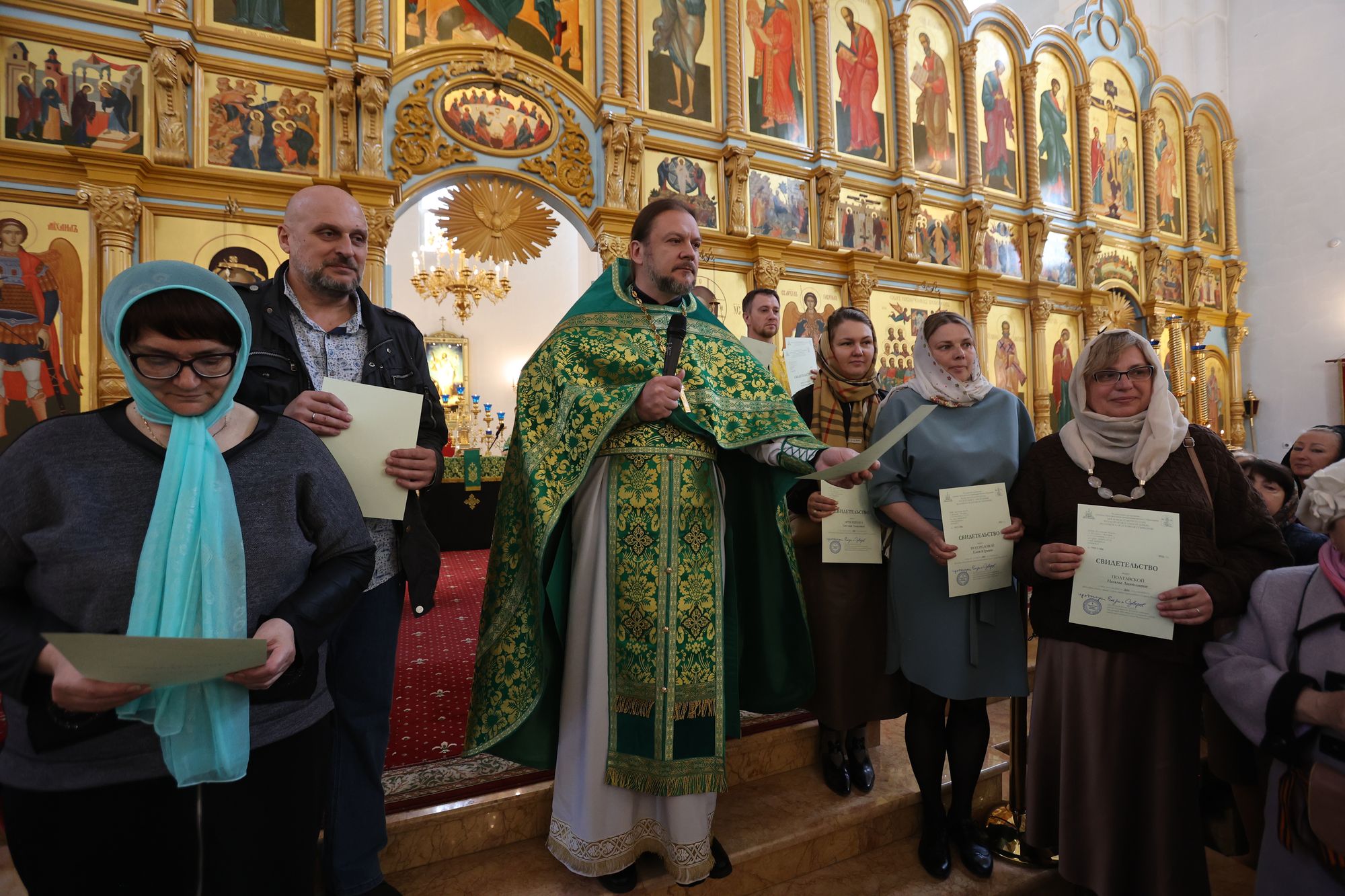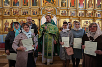 По окончании службы отец Сергий поздравил прихожан с праздником и торжественно вручил свидетельства выпускникам епархиальных Библейско-богословских курсов имени преподобного Сергия Радонежского.