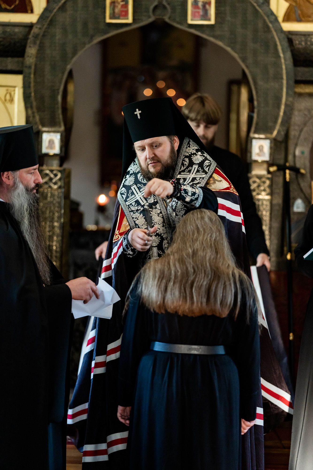 На постриге присутствовали благочинный монастырей Подольской епархии, игумен Вознесенской Давидовой пустыни Сергий (Куксов), игумения Серафимо-Знаменского скита Иннокентия (Попова), насельницы монастыря. Затем владыка совершил постриг инокини Зои Яриной в мантию с наречением имени Севастиана, в честь преподобного Севастиана Фомина.