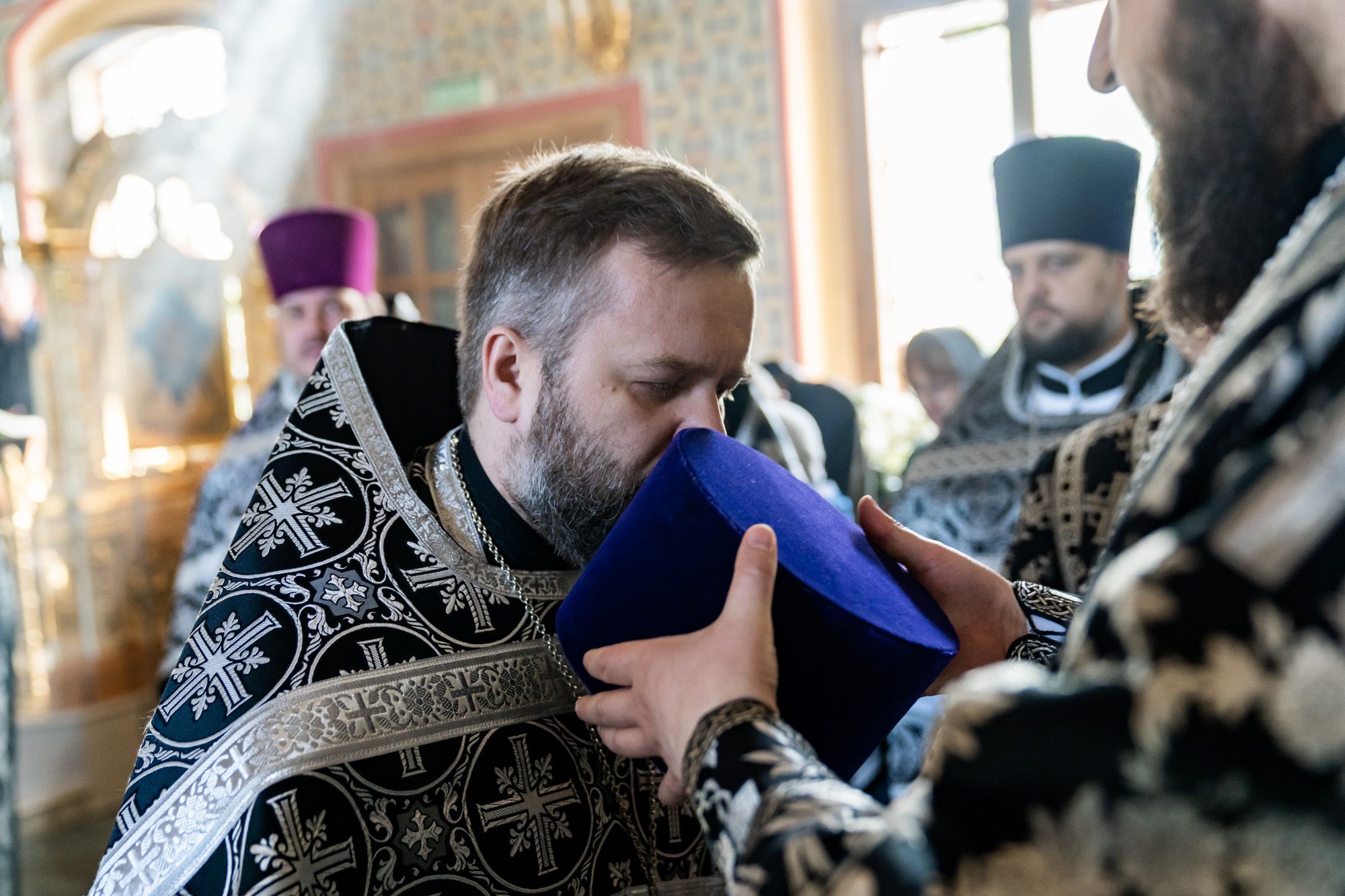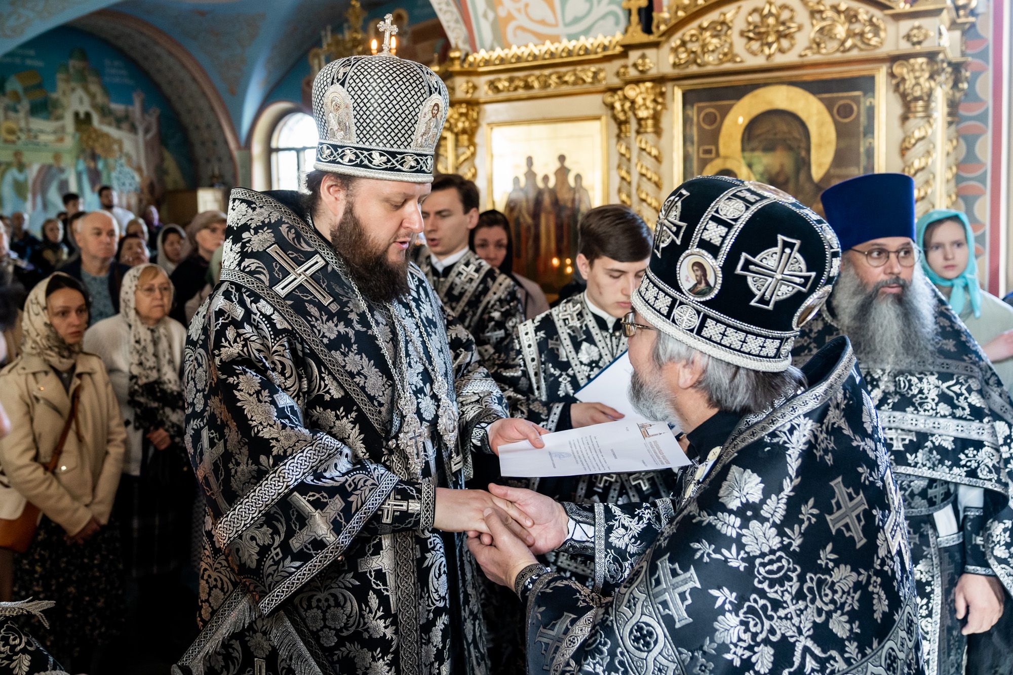 На малом входе владыка Аксий вручил богослужебно-иерархические награды к празднику Святой Пасхи клирикам благочиния.