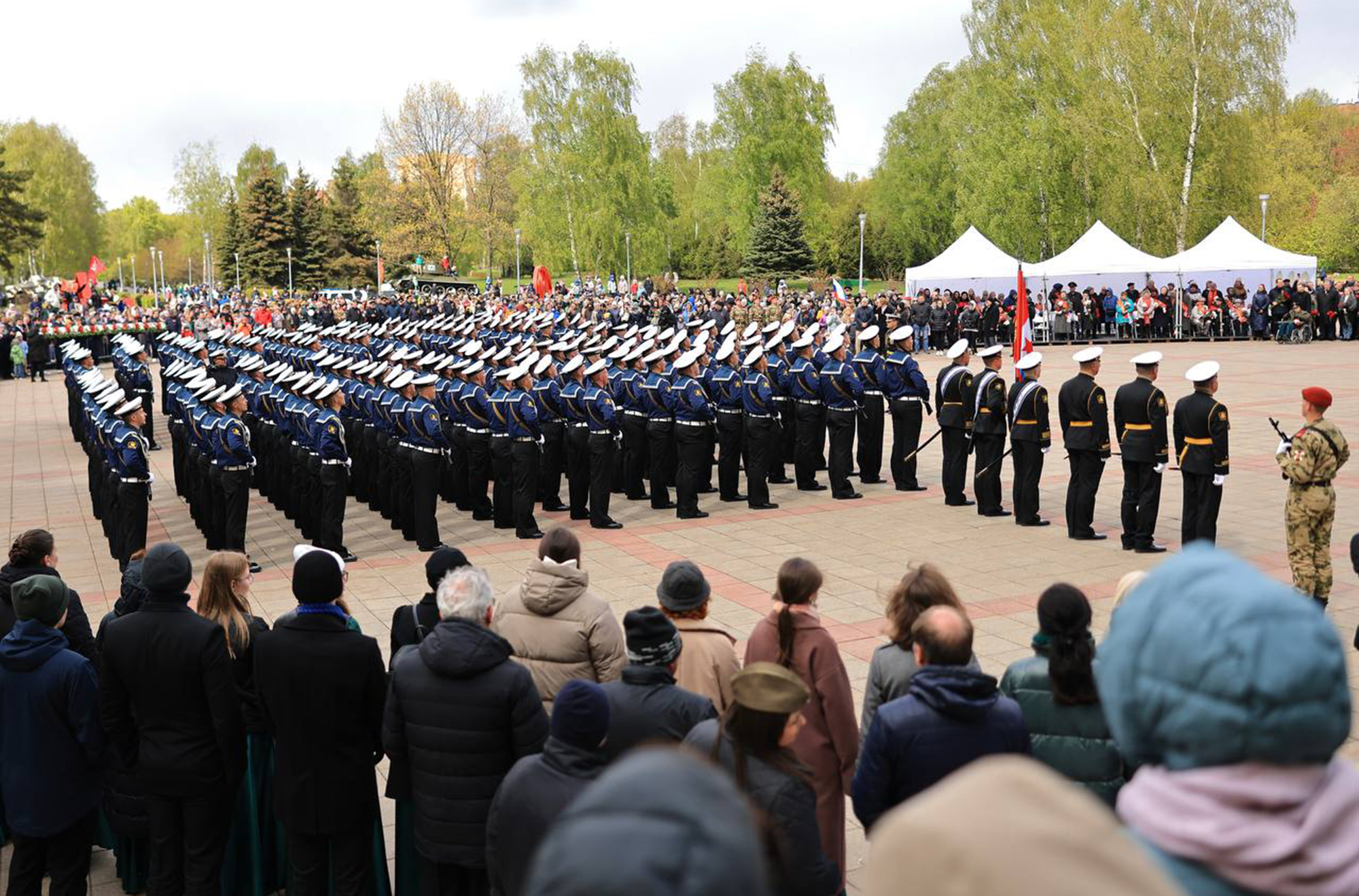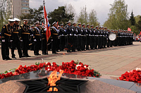 Торжественным маршем по Площади Победы Мемориала Славы прошел парадный расчёт курсантов Морского Корпуса Петра Великого - старейшего учебного заведения России, где осуществляется подготовка будущих офицеров для службы на кораблях и подводных лодках военно-морского флота.