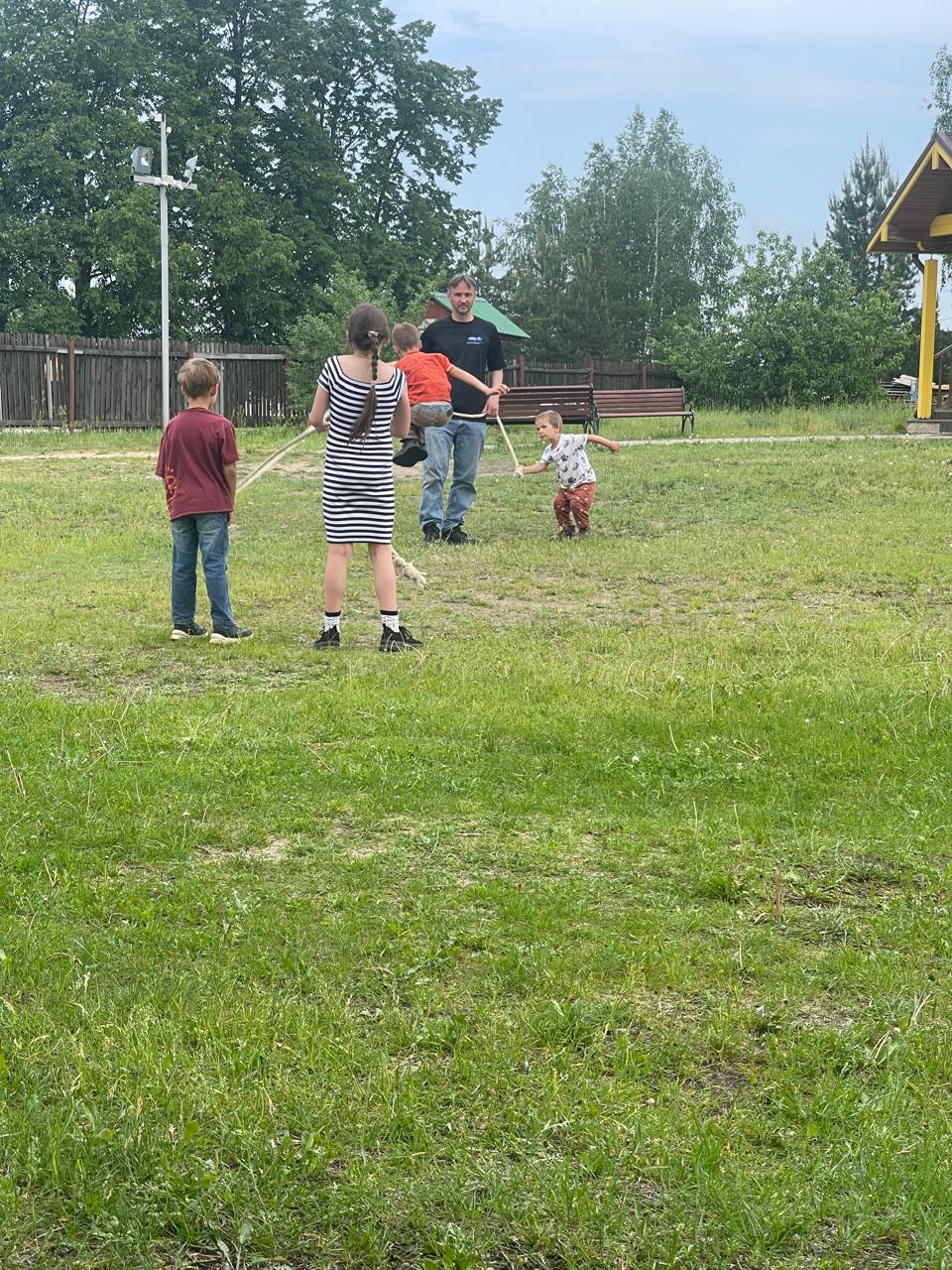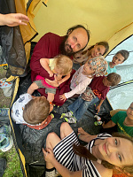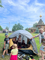 День защиты детей в Воскресной школе "Горлица" при Введенском храме деревни Рыжево 2-го Егорьевского благочиния отметили 2 июня 2024 года семейным пикником на открытом воздухе. Родители устроили для малышей песочницу, а для детей постарше установили волейбольную сетку, провели мастер-класс по установке палатки.