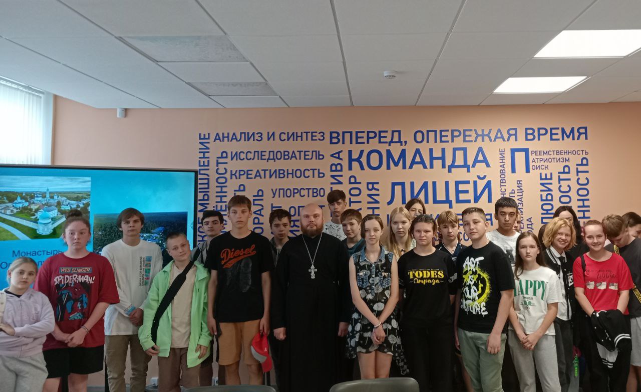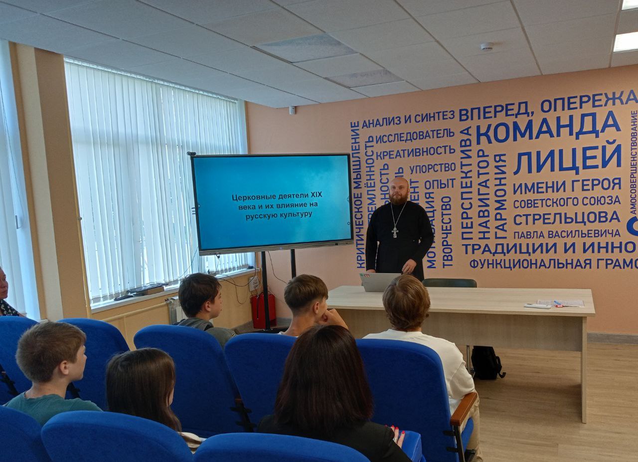 18 мая в рамках регионального проекта «Умные каникулы» в МОУ «Лицей им. Героя Советского Союза Стрельцова П. В.» г. Воскресенска состоялась встреча учащихся 8-х классов с клириком Иерусалимского храма г. Воскресенска иереем Евгением Ромашкиным. Священнослужитель провел интерактивную лекцию на тему «Церковные деятели 19 века и их влияние на русскую культуру», в которой рассказал ученикам о святителе Филарете Московском, а также о связи выдающихся писателей той эпохи с подвижниками Оптиной Пустыни.