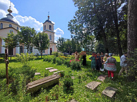 Во главе с настоятелем Сергиевского храма иереем Романом Волощенко группа посетила село Новоникольское, где осмотрели старинные надгробия приходского кладбища, остатки усадебных построек и Вознесенскую церковь, и поклонились главной святыне храма – Иверской иконе Пресвятой Богородицы. Церковь была построена в 1827 году на средства помещиков Савеловых, а главная устроительница – Елизавета Михайловна - была похоронена у стен храма. Многолетними прихожанами были члены нескольких поколений семьи Гарднеров - владельцев фарфоровой фабрики. Частыми гостями в Новоникольском были дворяне Корсаковы, их имение Тарусово располагалось неподалёку. Троицкий храм в селе Троице-Вязники, в котором молились Корсаковы, также был включён в экскурсионный маршрут. Как и фамильный некрополь дворян Корсаковых, где похоронены Герой Отечественной войны 1812 года, врач-гомеопат и изобретатель интеллектуальных машин Семён Николаевич и его сын Михаил Семёнович - видный государственный деятель, генерал-губернатор Восточной Сибири.